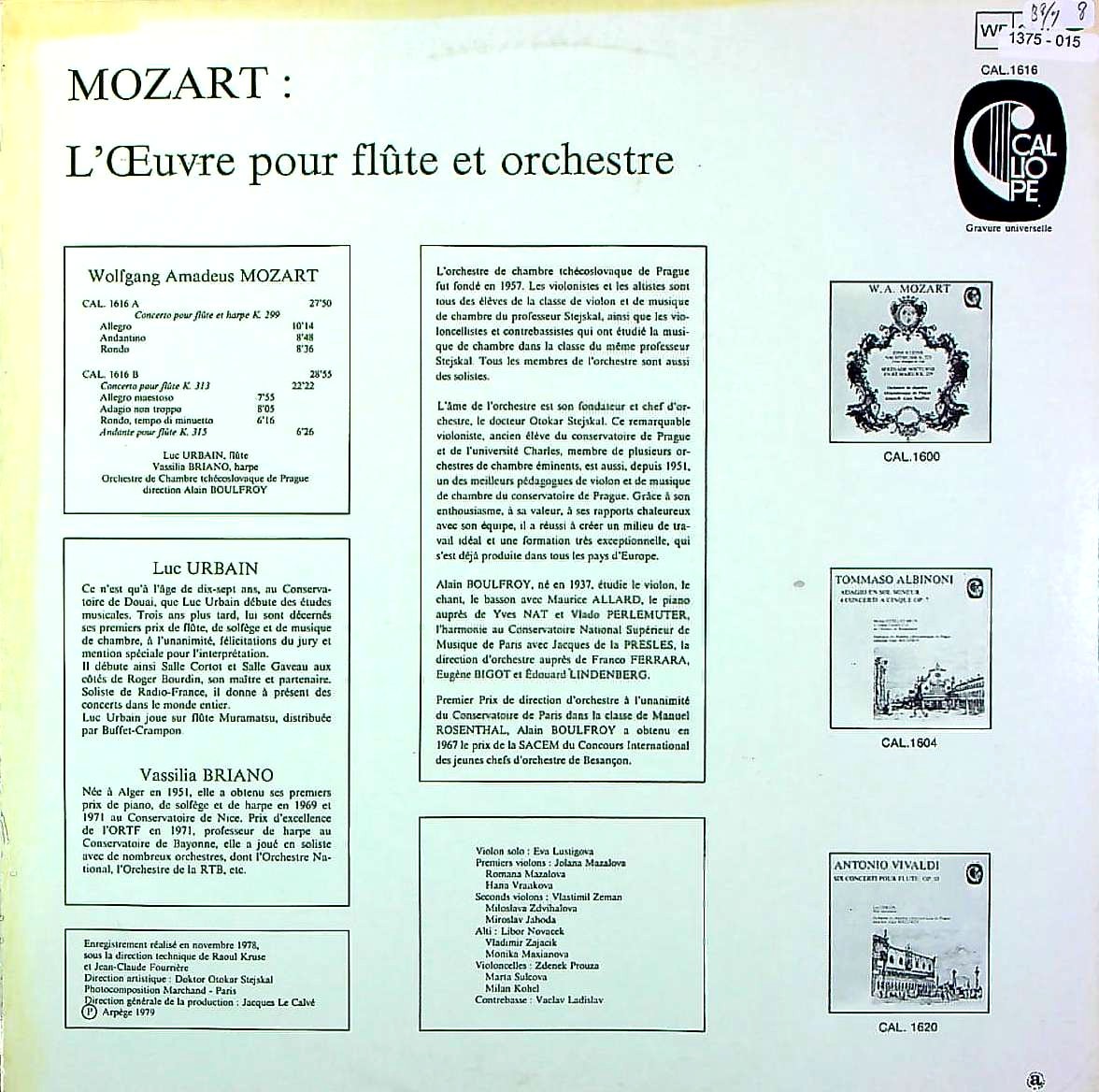 商品コード:1375-015[CALLIOPE] L.ユルバン(fl) V.ブリアーノ(hp)/ モーツァルト:Fl・Hp協奏曲K.299, Fl協奏曲1番K.313, アンダンテK.315