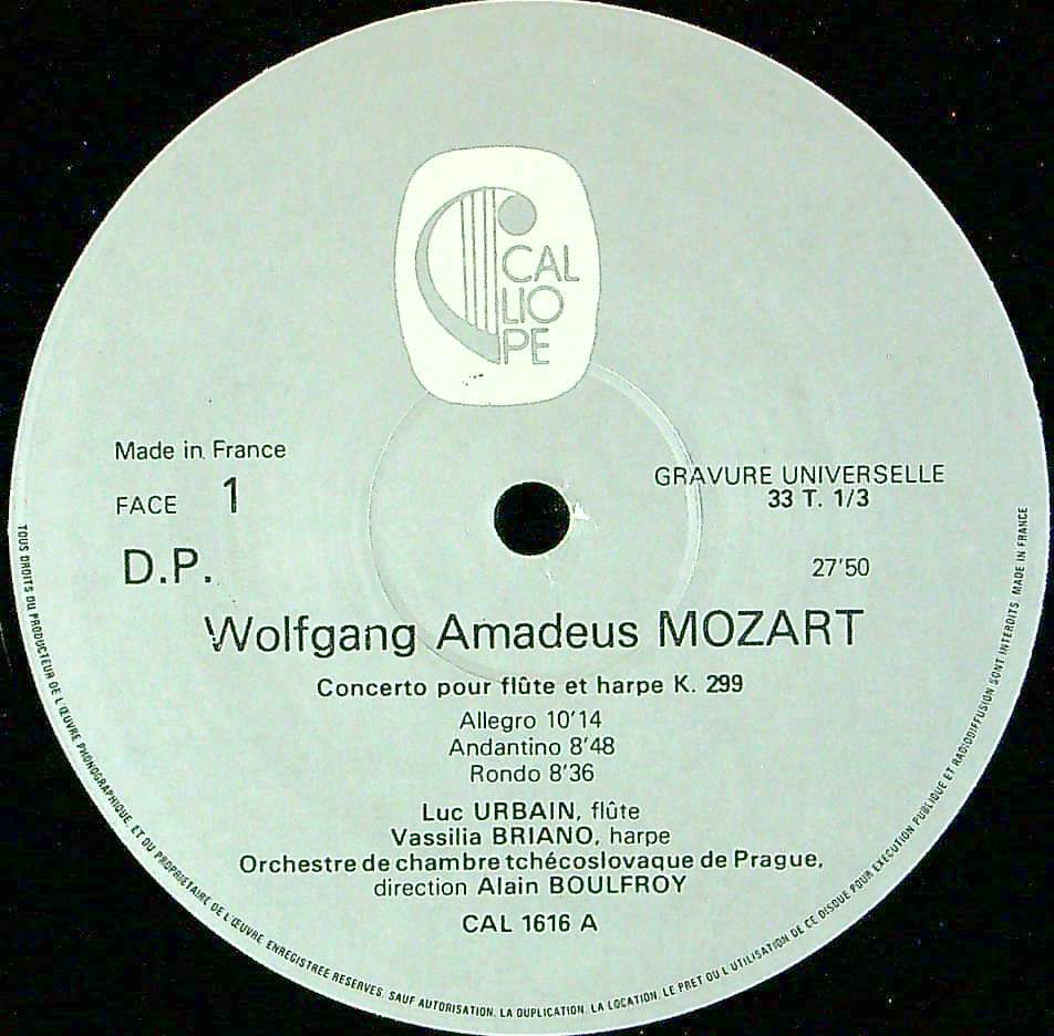 商品詳細:1978年の録音ながら流石は仏CALLIOPE。このような作品にもレーベルのポリシーが浸透している。殆ど入荷のないレア盤。FlのL.ユルバンは1930年代仏生まれ? 17歳でドゥエ音楽院で学び、R.ブラダン、マリオンらとORTFで活動、その後パイヤール室内o.等にも参加。同じCALLIOPEにバッハのFlソナタ集(レア)もある。Hpのブリアーノは1951年オルジェ生まれ、同じくORTFの奏者として活動。モーツァルティアンにはかなりの珍品にして秀演。この機会に是非。リュック・ユルバンに関しての情報は殆どない。パリ音楽院室内o.の首席フルート奏者であったことしか記載がない。1979年LP2枚でバッハのフルート・ソナタ全7曲を録音している。フランスの小さいが個性あるマイナーレーベルであるCALLIOPEは音質も良く、内容も吟味されたレーベルで、無伴奏Vcソナタではアンドレ・ナヴァラが担当したくらいである。有名でなくともユルバンの実力は折り紙付き。又ユルバンは日本のムラマツ・フルートを使っている。これはプレスが非常に少なかったようで当社30年間の入荷記録でも今回で3度目の入荷となる。ムラマツ・フルートの音はやはり特徴的で、それを楽しむならこれは素晴らしいLPである。CALLIOPEは高音質録音で知られるレーベルだが、この録音は更にブリュエル測定マイク使用の直録り高音質録音されたらしい。具体的な方式は不明だがK.299のみグループレーベルから45回転12"LPで出された所を見ると音質には自信があったようである。聴いてみると、この時代にしては殆どエコー分を感じないストレートで直接的な音が飛んでくる。CALLIOPEの中でも特に気を使った録音らしい。フランス人指揮者アラン・ブルフロワとチェコスロバキア室内o.プラハのフランスでの録音はCALLIOPEに数点出ていて室内オケの一翼を担っていた。希少な上、高音質の貴重なモーツァルトLP!チェコスロバキア室内o.プラハは、SUPRAPHONに録音のあるチェコ室内o.とは全く別の団体。