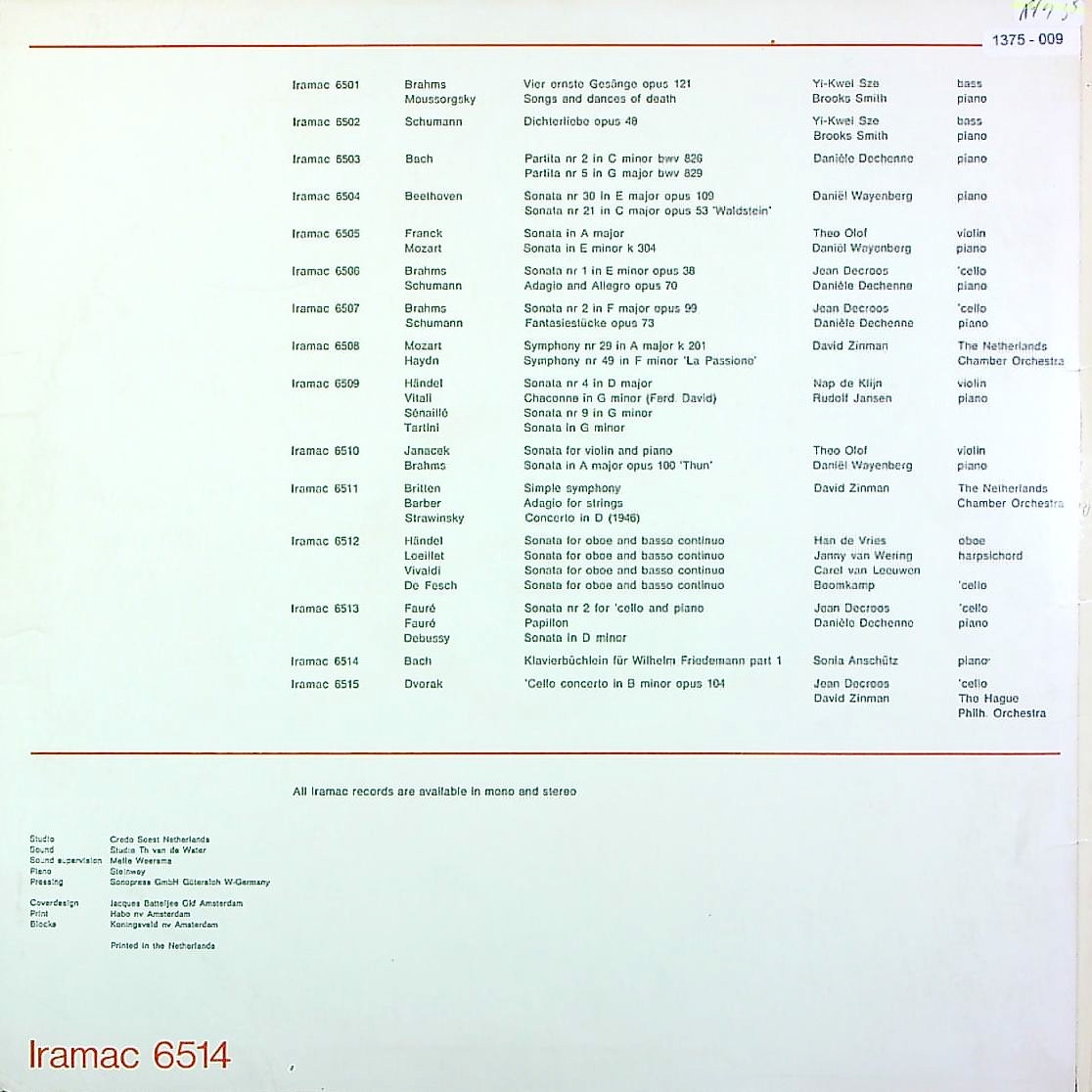 商品詳細:ピアニスト、ソニア・アンシュッツの詳しい経歴は不明。ベルギーのアントワープ生まれ。ブリュッセルでマルセル・マースに師事。アニー・フィッシャーの薫陶も受けた。1948年頃プロデビューして欧州各地で演奏をしたらしい。活動はベルギー国内が中心だった為、国際的な知名度は低い。グリュミオーとの共演経験もあるようだ。IRAMACレーベルはオランダあるいはゆかりの音楽家の演奏を供給する地域レーベルで、製造関係はPhilipsに依存している。1960年代中期から小規模な運営を行っている。「W.フリーデマン・バッハのためのクラヴィア小品集」は、長男・ヴィルヘルム・フリーデマン・バッハ(1710-1784)が9歳になったケーテン時代1720年から、バッハがレッスン用に溜めておいた曲から抜粋して執筆されている。バッハ自身の曲(初期草稿など)やフリーデマンが書いたもの、バッハ以外の作曲家の作品も含まれる。1722年からのアンナ・マグダレーナ・バッハの音楽帳(のうちクラヴィア曲)と比べると難易度が少し高い。全63曲存在する。この曲集は、フリーデマンが、鍵盤楽器を弾けるようになるために、編んだ曲集ではなく「 作曲 」 を学ぶために編まれたも。この曲集に、「 平均律クラヴィーア曲集第 1巻 」 の、前奏曲 1番 ~ 12番 ( 7番を除く ) と「 インヴェンションとシンフォニア 」の、大半の初稿が入ってる。平均律の初稿であると同時に、独立した作品でもあるということ。作品集とは別に音楽帳をそのまま録音したLPは少なく貴重である。未完成作品との誤解を受けがちだが、これはバッハが編纂した作曲技法の音楽帳であり、完成作品と関連付けて聴くことで作品の創作過程がわかることになる。これ自体が鑑賞作品としても存在できるところにバッハの偉大さが理解できる。
