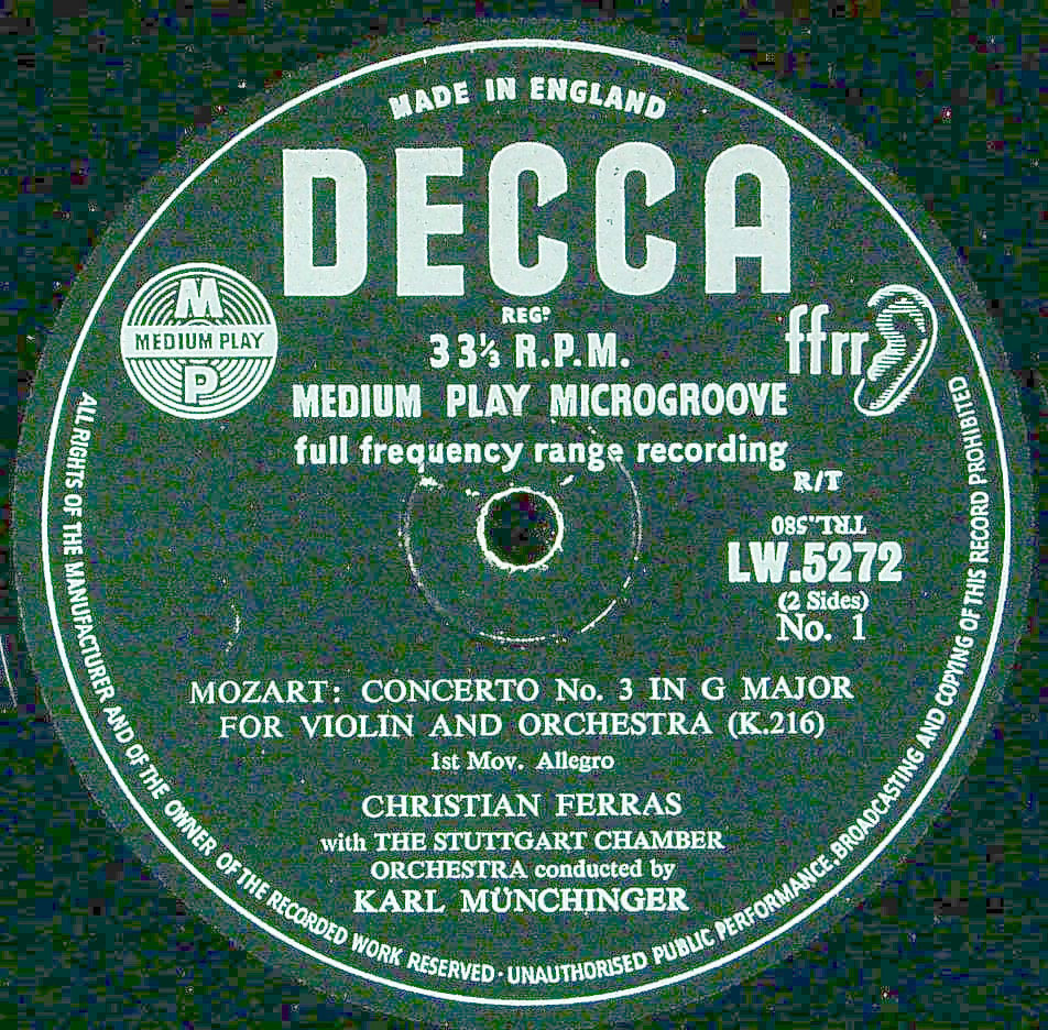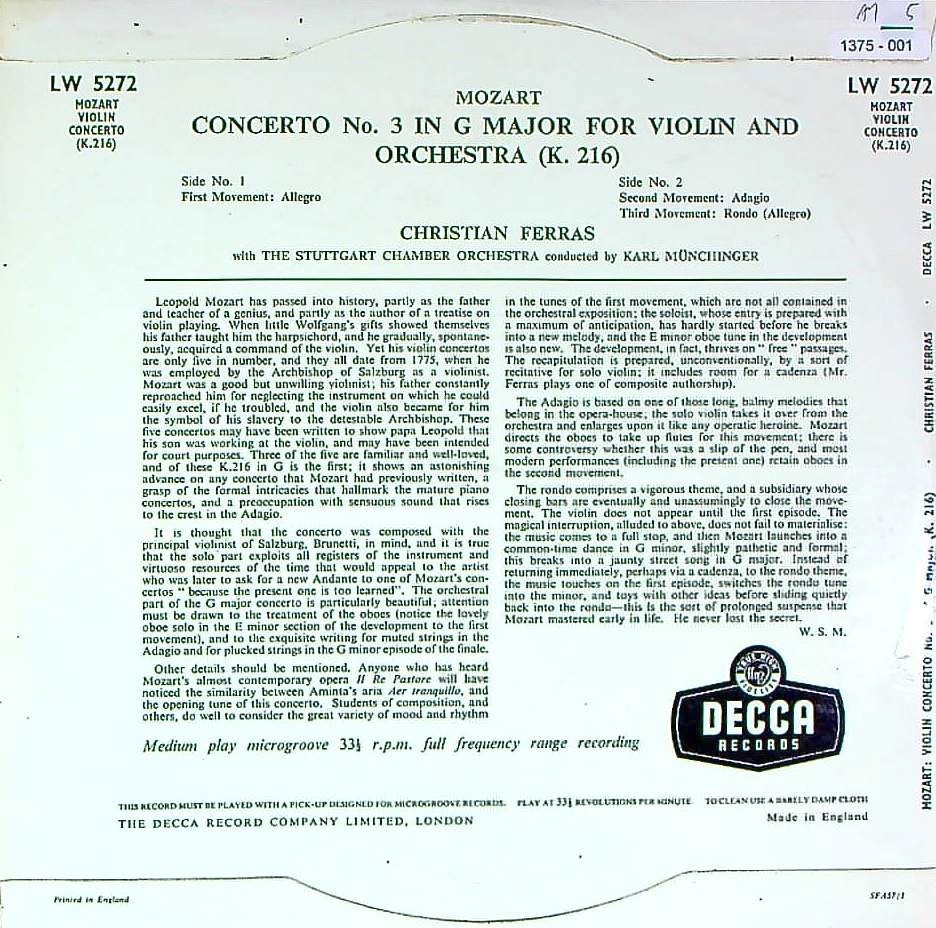 商品コード:1375-001[DECCA] C.フェラス(vn)/ モーツァルト:Vn協奏曲3番K.216