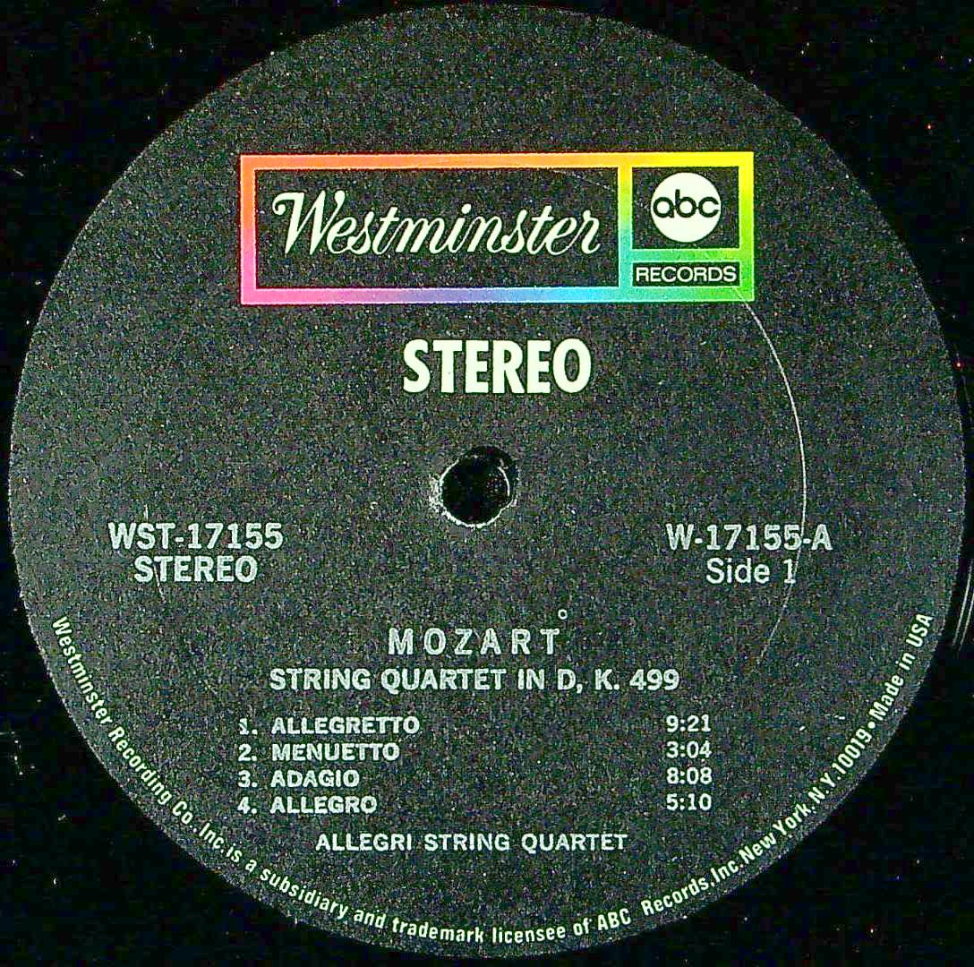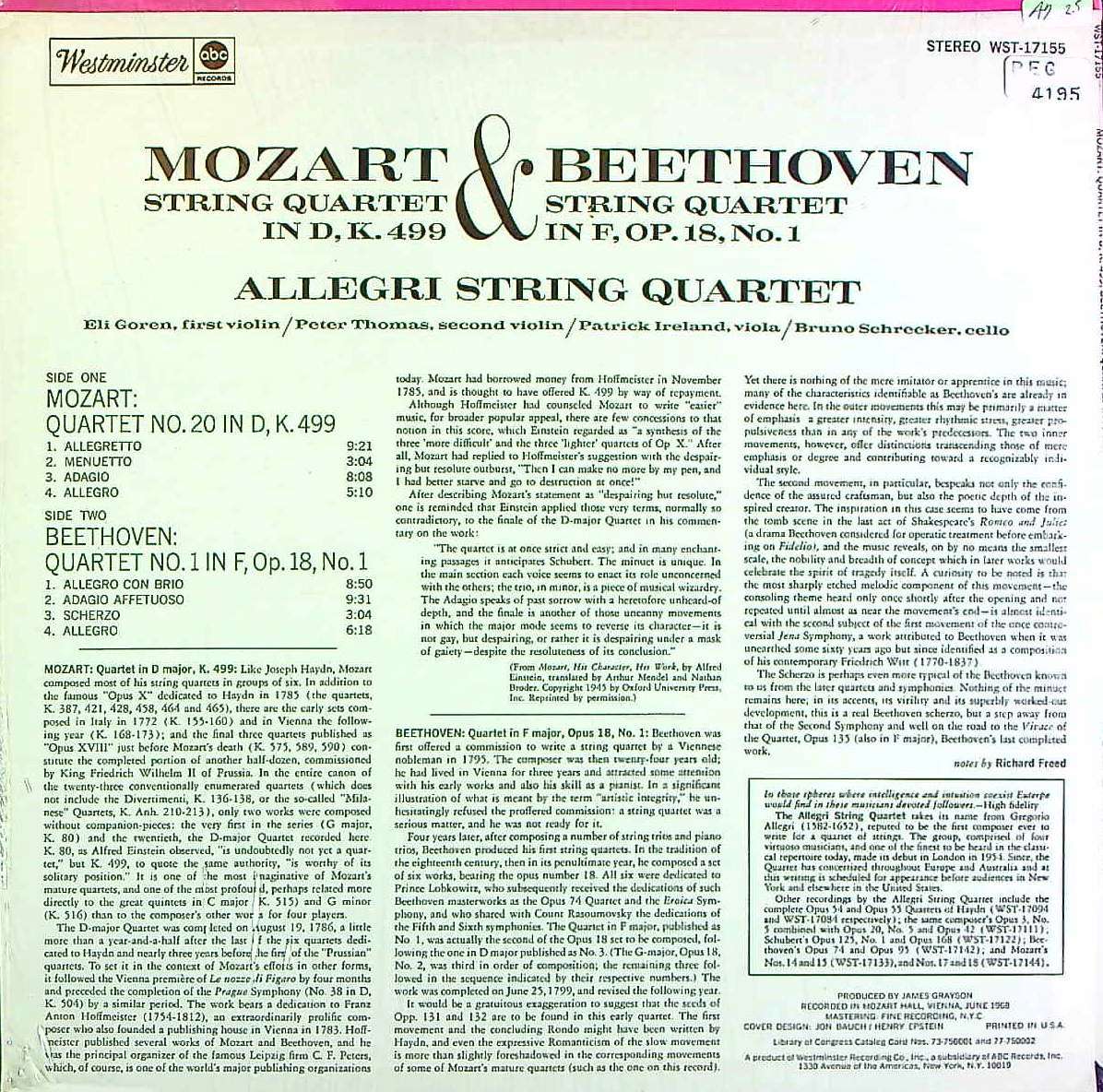 商品コード:REG-4195p[WESTMINSTER] E.ゴーレン, P.トーマス(vn) P.アイルランド(va) B.シュレッカー(vc) / モーツァルト:SQ20番, ベートーヴェン:SQ1番