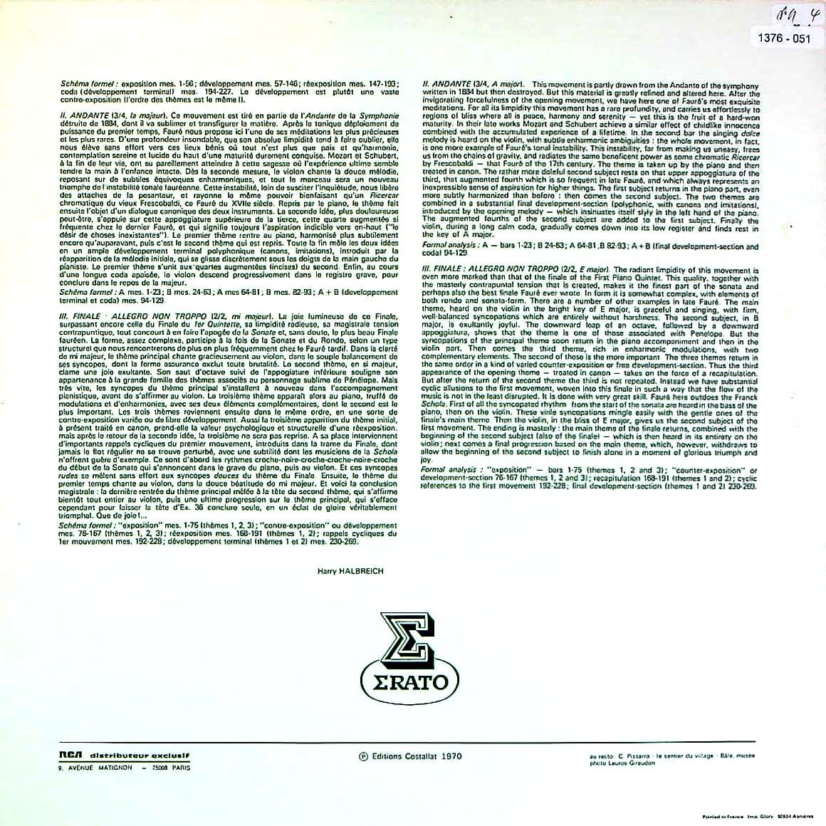 商品詳細:STU 70550-4の全5枚でフォーレの室内楽を極めた、ERATOで初の室内楽全集録音。同じ頃、VSMでもコラール達によって同種の企画が進められたが、ユボー、ナヴァラが居るERATOの方が、よりフォーレらしい感覚を持っている。残念ながら全5枚揃えることは難しい。フォーレの室内楽は演奏が良ければ聴くほどに味わいが深まり、理解が進む曲である。今まで纏まった録音がなかったのが不思議。初出の紺白レーベルは近年では超が付く希少盤。1970年代とはいえこれまでERATOでさえ纏まった全集録音がないのが現状であった。この録音はパリ音楽院室内楽科教授のジャン・ユボーを中心にしたフランスの精鋭たちが録音、史上初となった全集である。ガブリエル・フォーレ( 1845 - 1924)の生誕125周年、没後45周年に当たり、それまで録音を待っていたのではないかと思われる。遅きに感じるがそれでもERATOというフランスを代表するレーベルが手掛けた室内楽全集録音は録音当時の最高ランクの演奏であることは間違いのない事実である。CALLIOPEのラヴェルの室内楽全集録音とともに1970年代の代表する傑作シリーズである。このシリーズ録音は仏ACCディスク大賞を受賞した。室内楽全集には様々な器楽奏者が必要となる為、1960年代まではキャストの効率を重視する意味で作曲家ごとの室内楽全集録音は殆ど企画されなかった。1970年代に入り、レコードの市場規模の拡大と市場の要請によりこのようなシリーズ企画が可能になった。そのような時代背景を理解すれば、録音時期に関しては理解されるだろう。1950-60年代の名手たちによる録音に越したことはないが、歴史とは傍観者の希望には応えてくれないものである。Vol.4の土手付オリジナル盤は未入荷!