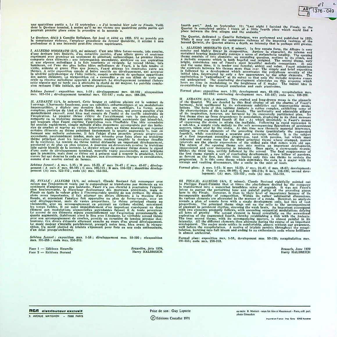 商品詳細:STU 70550-4の全5枚でフォーレの室内楽を極めた、ERATOで初の室内楽全集録音。同じ頃、VSMでもコラール達によって同種の企画が進められたが、ユボー、ナヴァラが居るERATOの方が、よりフォーレらしい感覚を持っている。残念ながら全5枚揃えることは難しい。フォーレの室内楽は演奏が良ければ聴くほどに味わいが深まり、理解が進む曲である。今まで纏まった録音がなかったのが不思議。初出の紺白レーベルは近年では超が付く希少盤。1970年代とはいえこれまでERATOでさえ纏まった全集録音がないのが現状であった。この録音はパリ音楽院室内楽科教授のジャン・ユボーを中心にしたフランスの精鋭たちが録音、史上初となった全集である。ガブリエル・フォーレ( 1845 - 1924)の生誕125周年、没後45周年に当たり、それまで録音を待っていたのではないかと思われる。遅きに感じるがそれでもERATOというフランスを代表するレーベルが手掛けた室内楽全集録音は録音当時の最高ランクの演奏であることは間違いのない事実である。CALLIOPEのラヴェルの室内楽全集録音とともに1970年代の代表する傑作シリーズである。このシリーズ録音は仏ACCディスク大賞を受賞した。室内楽全集には様々な器楽奏者が必要となる為、1960年代まではキャストの効率を重視する意味で作曲家ごとの室内楽全集録音は殆ど企画されなかった。1970年代に入り、レコードの市場規模の拡大と市場の要請によりこのようなシリーズ企画が可能になった。そのような時代背景を理解すれば、録音時期に関しては理解されるだろう。1950-60年代の名手たちによる録音に越したことはないが、歴史とは傍観者の希望には応えてくれないものである。