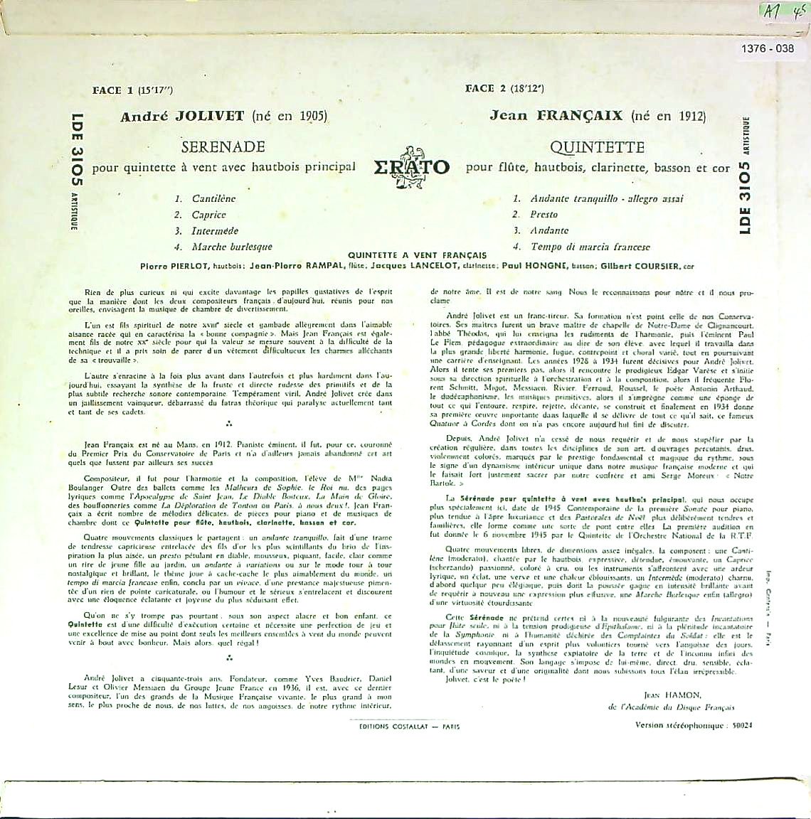 商品コード:1376-038p[ERATO] フランス管楽五重奏団/ ジョリヴェ:セレナーテ(木管五重奏曲), フランセ:木管五重奏曲1番