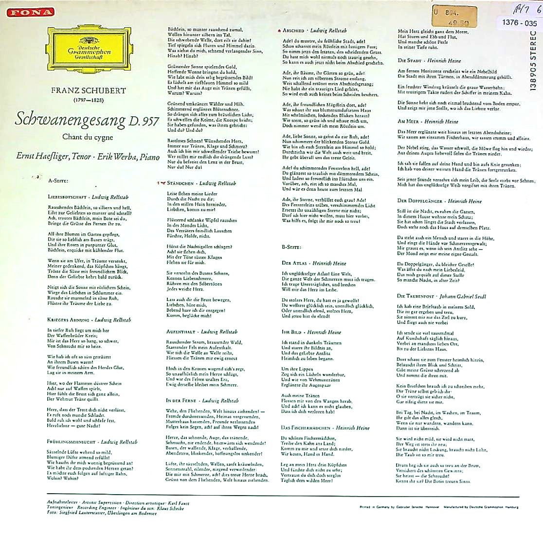 商品コード:1376-035[DGG] E.ヘフリガー(t)/ シューベルト:歌曲集「白鳥の歌」D.957/D.965a(全14曲)