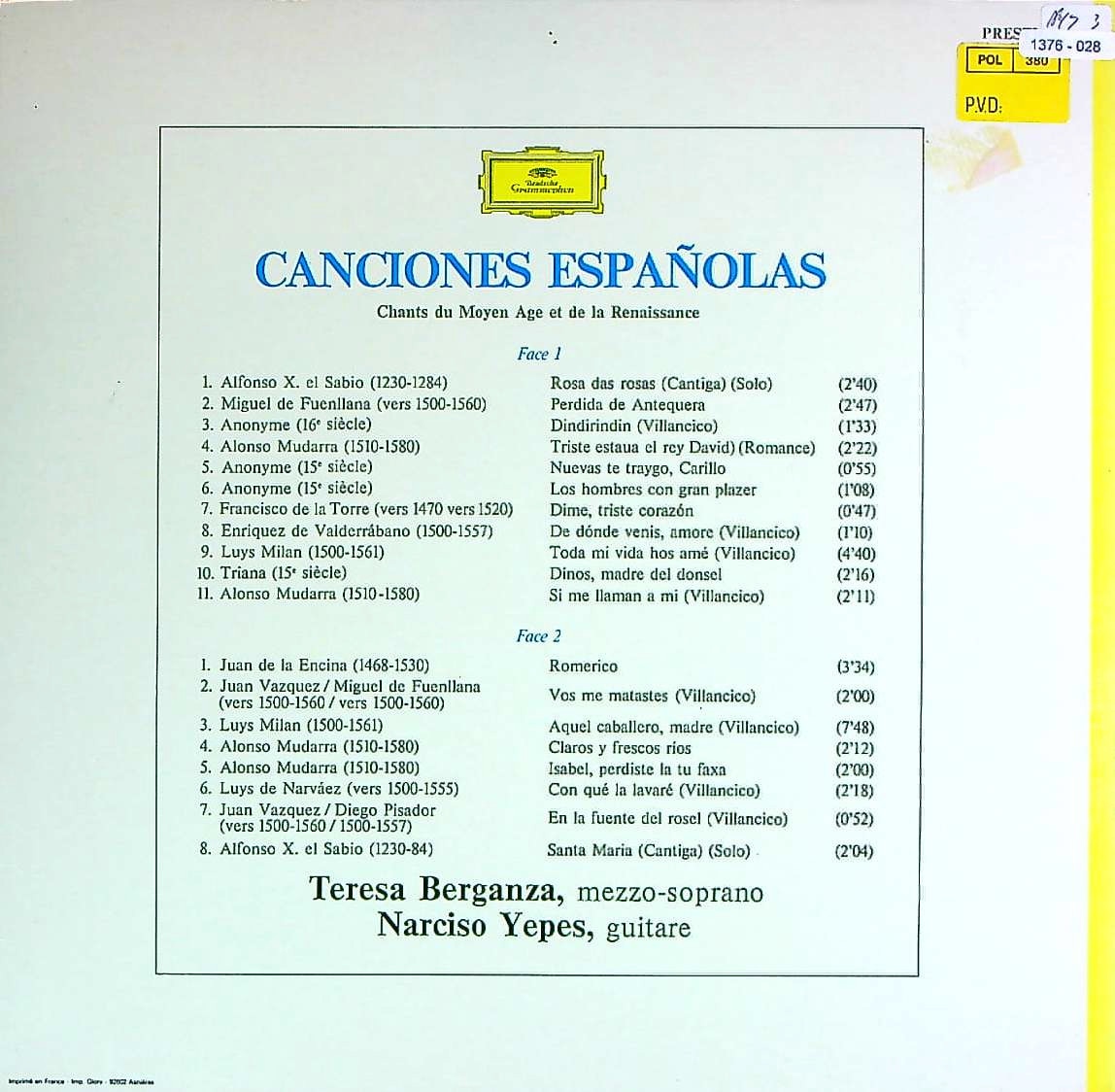 商品コード:1376-028[DGG] T.ベルガンサ(ms) N.イエペス(g) / スペイン歌曲集/サビオ, ミラン, ムダーラ, ナルヴァエス, トッレ 他