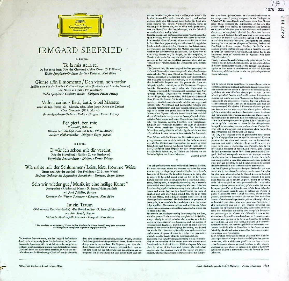 商品詳細:ゼーフリートの企画リサイタル盤。これらは一度に録音されたものではなく、所謂企画LP。おそらく既存音源の中からの選曲と思われる。古くは1944年ベーム指揮の「ナクソス島のアリアドネ」のステレオ録音から1曲、他は1957年~1960年までの様々な音源を集めて制作したゼーフリートのオペラ・アリア集。音源自体は全て初出ではないが、一人の歌手の録音として過去に集まったことのないものばかり。大手レーベルが得意とするリーダーアルバムである。しかし同じ'60年代の録音、プレスであるから、音質的な問題は殆ど無いと見てよい。内容は大変良く、しっとりと聴かせてくれるものばかり。ステレオでこうやって、まとまって聴けるのは嬉しい。全曲盤とは異なる魅力がある。ゼーフリートも彼女の美質をたっぷりと伝える好演。'65年の当盤でオリジナル。ステレオも存在する。