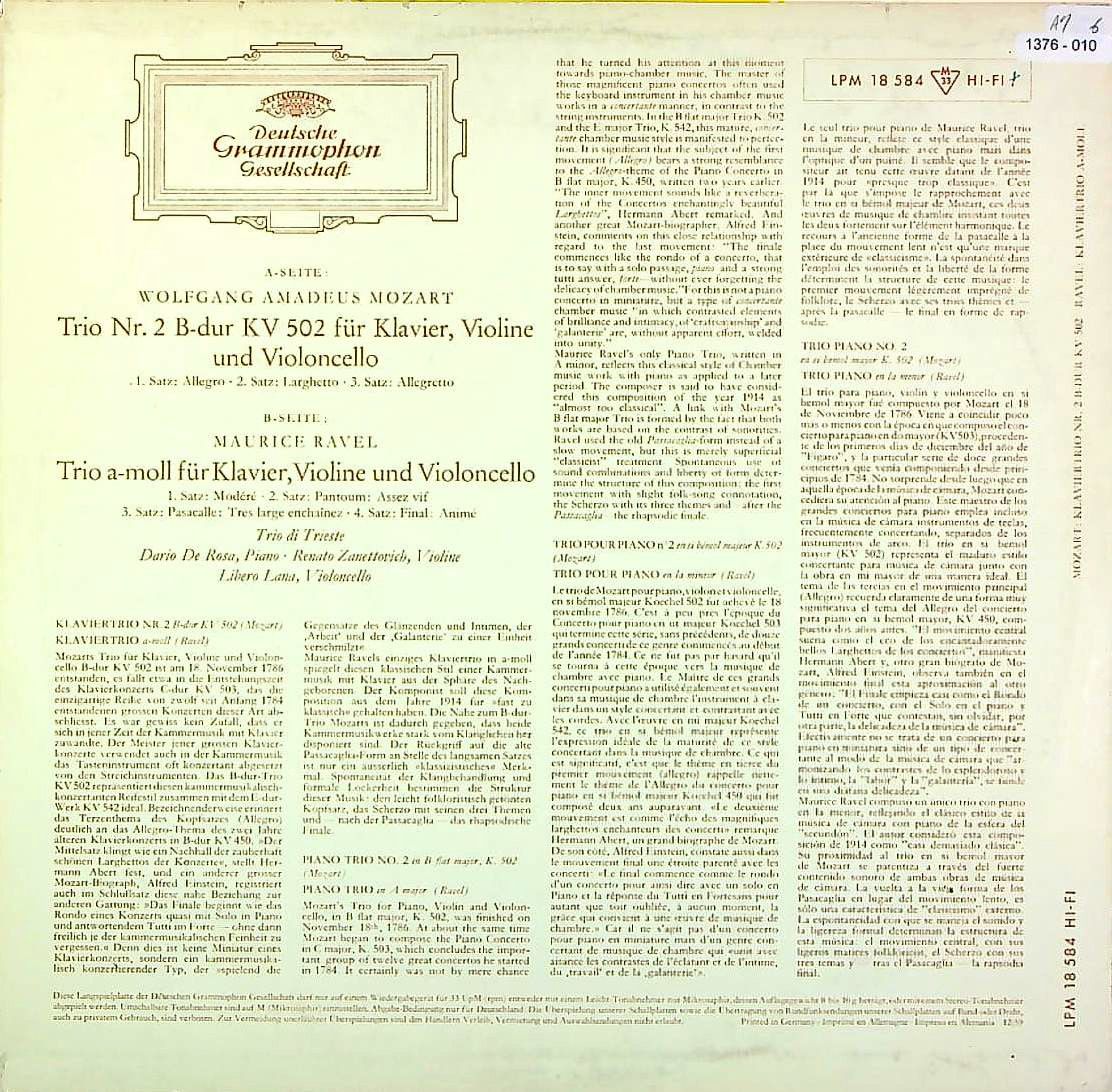 商品コード:1376-010[DGG] トリエステ・トリオ / モーツァルト:Pf三重奏曲4番K.502, ラヴェル:Pf三重奏曲 イ短調