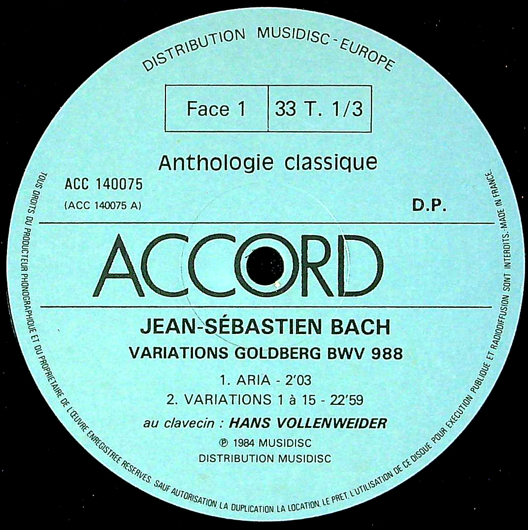 商品コード:1376-007[ACCORD] H.ヴォレヴェイダー(cemb) / バッハ:ゴルトベルク変奏曲B.988