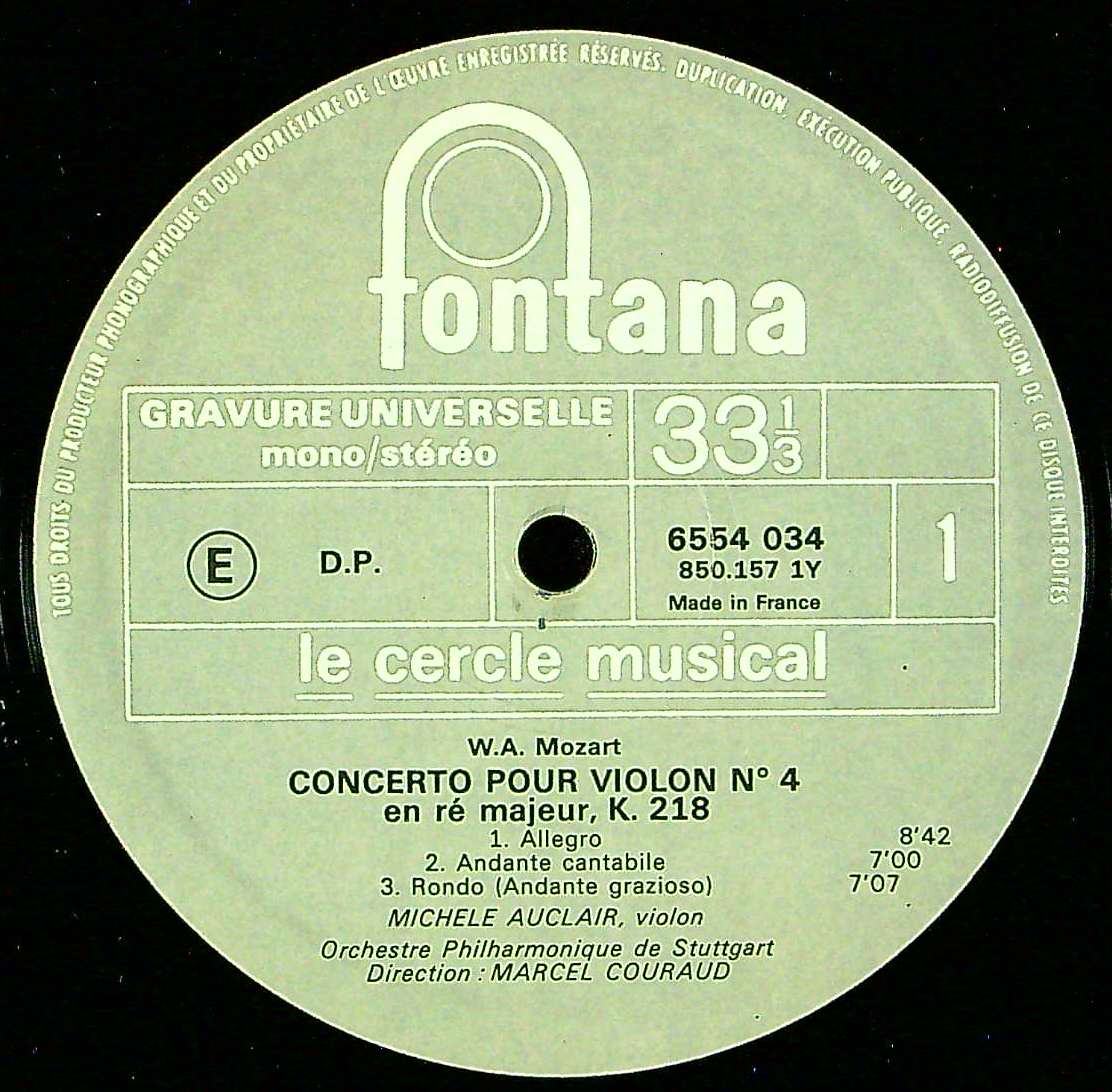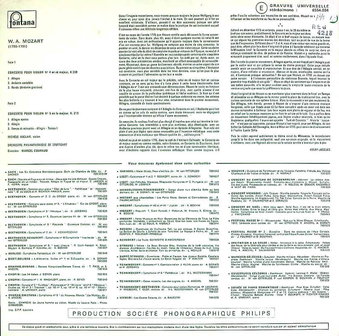 商品コード:REG-4218[欧FONTANA] M.オークレール(vn)/ モーツァルト:Vn協奏曲4番K.218, 5番K.219