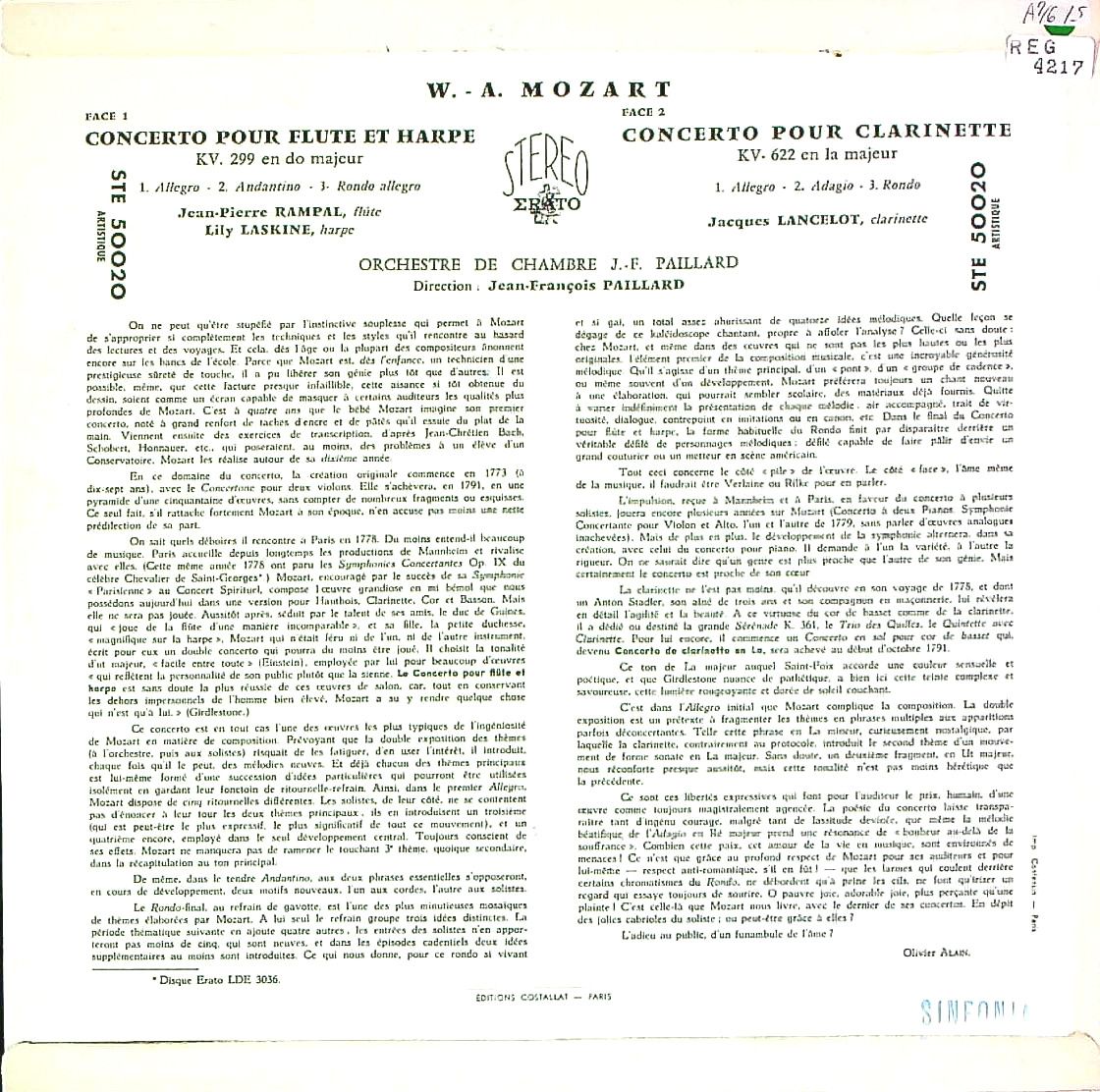 商品コード:REG-4217[仏ERATO] J.P.ランパル(fl)L.ラスキーヌ(hp) J.ランスロ(cl)/ モーツァルト:Fl・Hp協奏曲K.299, Cl協奏曲K.622