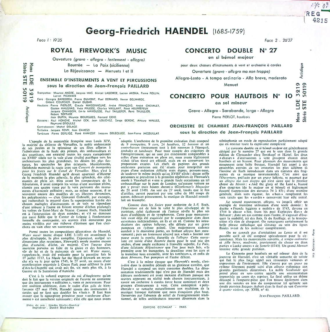 商品コード:REG-4215[仏ERATO] J.F.パイヤール / ヘンデル:王宮の花火の音楽, 二重協奏曲, Ob協奏曲