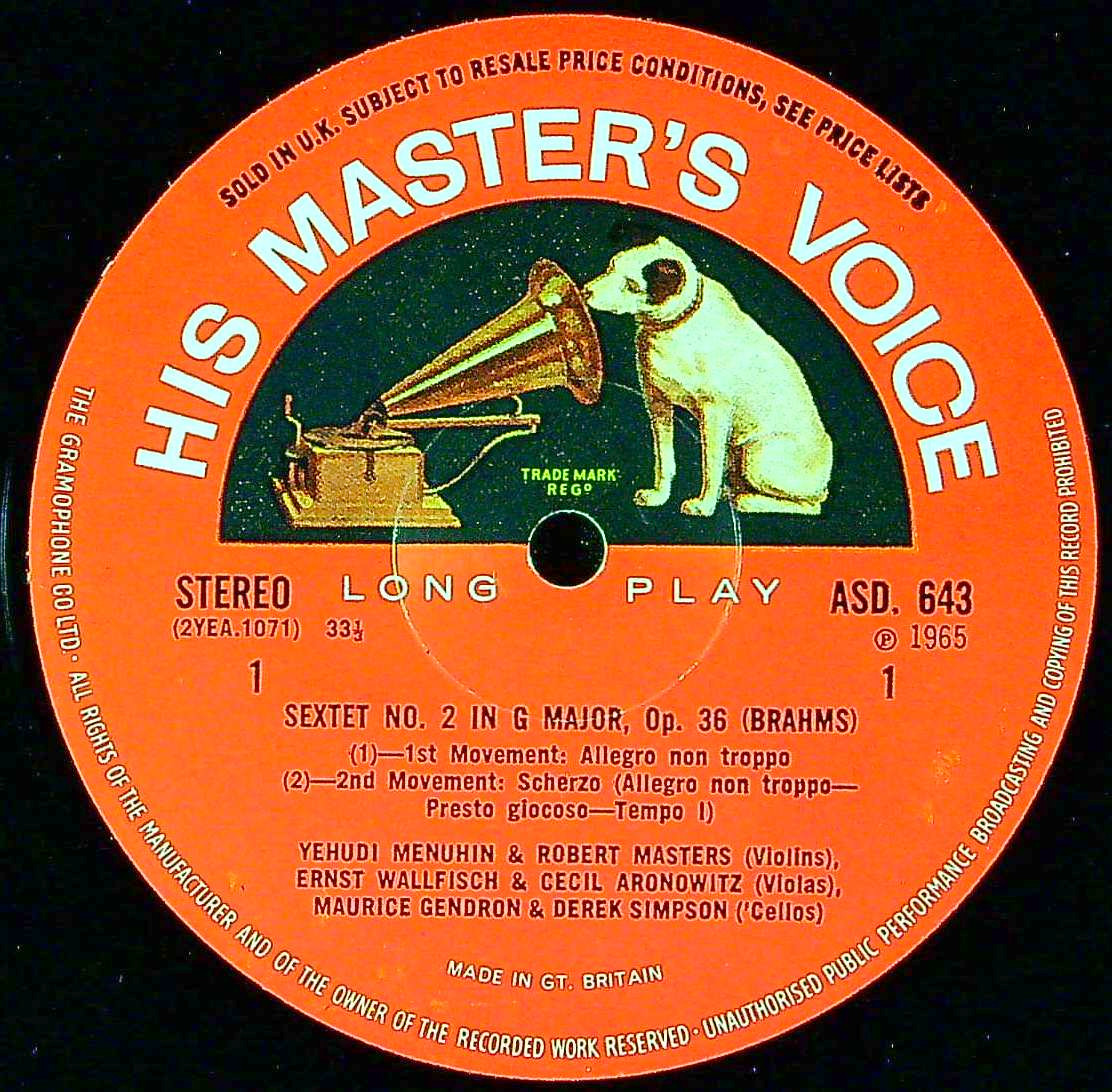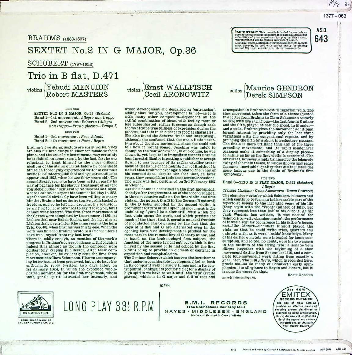 商品コード:1377-063[HMV] Y.メニューイン, R.マスターズ(vn) 他/ ブラームス:弦楽六重奏曲2番, シューベルト:弦楽三重奏曲1番(未完成・第1楽章のみ)
