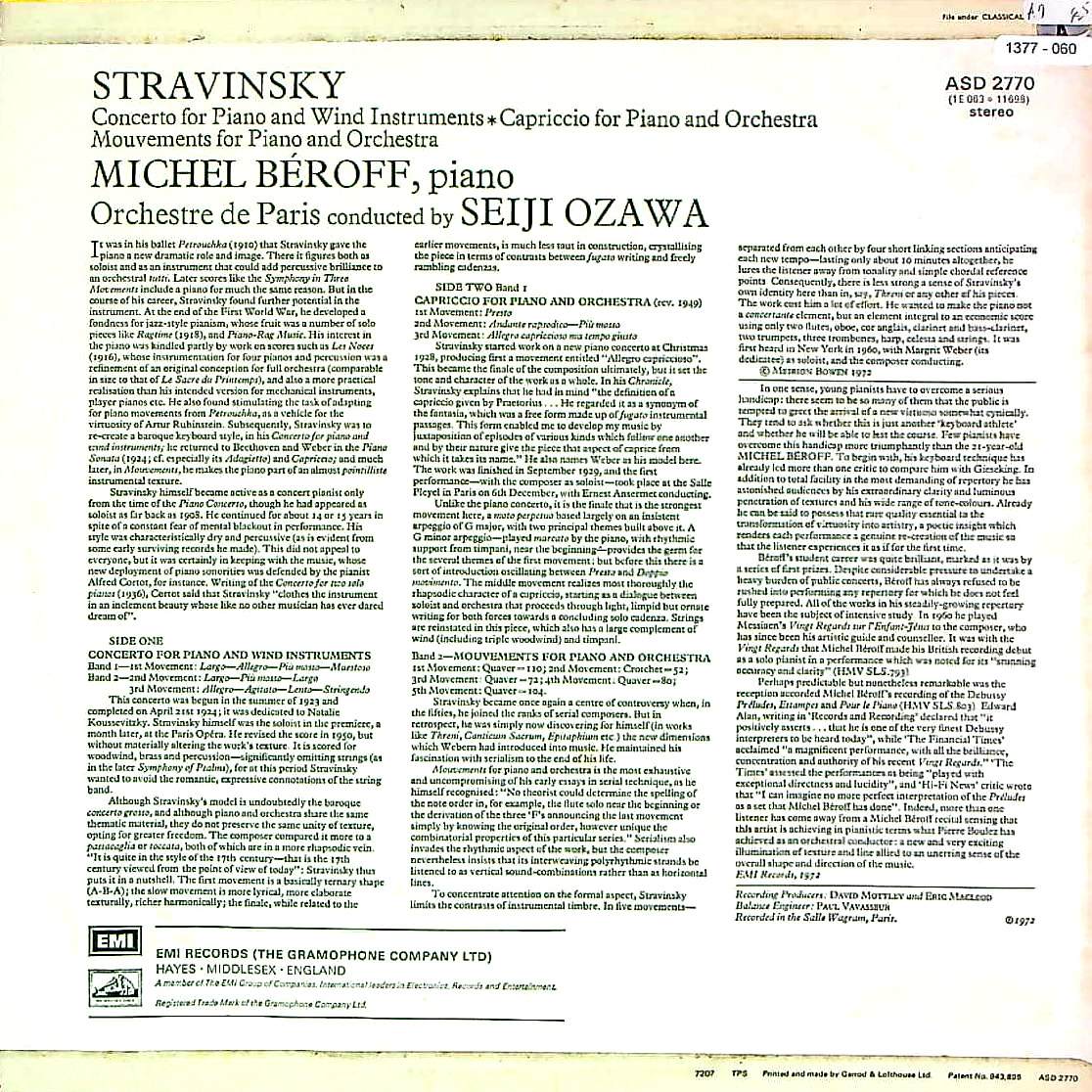 商品詳細:1971年10月のパリ。ミシェル・ベロフがまだ20歳代前半、一方、小澤征爾が30代の本当に脂の乗り切った時期で、互いに上昇気流に乗っていた時期の共演。小澤征爾は1970年頃からパリ管弦楽団に招かれ数点の録音を残している。1970年10月にはチャイコフスキー:交響曲第4番、1972年4月にはストラヴィンスキー:バレエ音楽「火の鳥」が知られる。パリ管弦楽団は1967年、パリ音楽院管弦楽団を発展的に解消し、シャルル・ミュンシュを音楽監督に迎えて新たに設立されたオケである。この際に団員の7割近くが入れ替わり、全仏から優秀な奏者が選抜されて新加入しているのでパリ音楽院管弦楽団が名称変更した同一団体ではない。新しいフランスのオケとみて間違いない。フランス文化省の大臣アンドレ・マルローはこの新しいオケで新しい試みを目論んでいたと思われる。第3世界からも優秀な指揮者を客演させ、国際的に開かれたオケを目指していた点は想像に固くない。その方向性に小澤征爾の存在はぴったりだったに違いない。それまで活躍の場が米国に限られていた小澤征爾がパリにやって来た。録音もEMI系でありDGGとはクオリティが異なる。この録音が行われた1971年は、ヘルベルト・フォン・カラヤン が、1968年に急逝したシャルル・ミュンシュの後任として音楽顧問に座ったが、それは名前を貸しただけと等しく、カラヤンはパリ管弦楽団とは僅かなLPしか録音していない。この時期は客演大歓迎のタイミングだった。1974年にはチャイコフスキーの交響曲第6番「悲愴」も録音している。小澤征爾はパリ管弦楽団の常任指揮者ではないが常連指揮者といっても差し支えない状態である。小澤征爾自身もパリ管弦楽団の常連となることで増々国際的指揮者としての名声を高めていった。そのような背景で録音されたストラヴィンスキーのピアノと管弦楽の作品3曲。ピアノのミシェル・ベロフ(1950-)はフランスヴォージュ県エピナル出身の新進気鋭のピアニスト。1967年の第1回オリヴィエ・メシアン国際コンクールに優勝する。EMI系に籍を置き、多くの録音を残した。二人の共演はLP時代ではこれが最初で最後。メシアンを得意としたベロフだけにストラヴィンスキーに対しても違和感はない。お互いのエネルギーをほどよくぶつけ合い、スリリングともいえる演奏となっている。意外なほど小澤はパンチの効いたオケで盛り上げる。