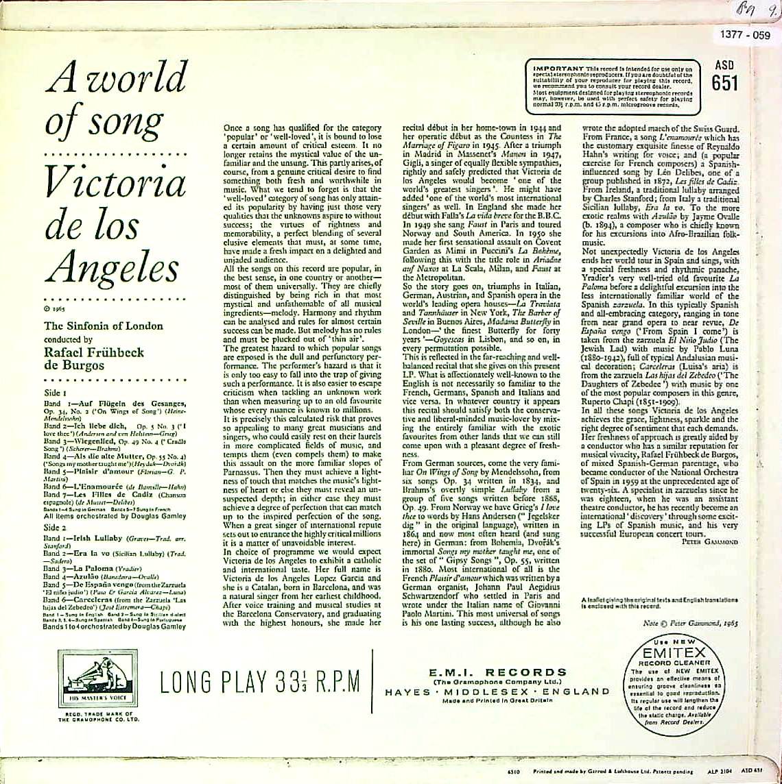 商品詳細:ロス・アンヘレスの中でも特に内容の良い一枚。オペラ・アリアとは全く異なる可憐な面を見せる。一度は聴いたことのある有名な歌ばかり13曲。オーケストラ伴奏付の歌曲集。彼女の得意なスペインものが多く、そちらが好きでない方には印象が良くない彼女だが、この録音はそんな方にも必ず満足いただける一枚と信じる。おしとやかな、よそ行きの顔だが、純真な気持ちが伝わってくる傑作。音質は大変良い。英国盤はA World Of Songというタイトル。ビクトリア・デ・ロス・アンヘレス(1923-2005)は、スペインの生んだ偉大なソプラソ歌手。国際的な大歌手として欧米で活躍、イタリア・オペラも得意とした。これは「メンデルスゾーン:歌の翼に」で始まる世界的な名曲ばかりを集めたLPで、クラシック音楽という狭い枠に収まらない普遍的な名曲集である。ロス・アンへレスの最もチャーミングな面を引き出した特別な作品集!大歌手と呼ばれるソプラノでありながら万人を幸福にする親しみを感じさせるLPである。グリーグ「君を愛す」、ドヴォルザーク「わが母の教えたまいし歌」などの名作曲家の歌曲をそれぞれの国の言葉で歌い、後半は各地の民謡を同様に各国語で雰囲気豊かに歌っている。