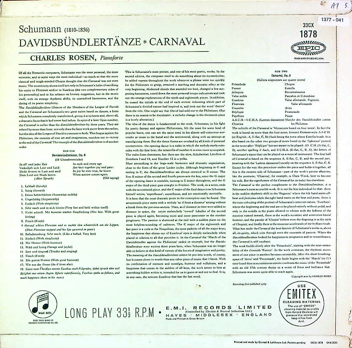 商品コード:1377-041[COLUMBIA] C.ローゼン(pf) / シューマン:Pf作品集/ダヴィッド同盟舞曲集Op.6, 謝肉祭Op.9