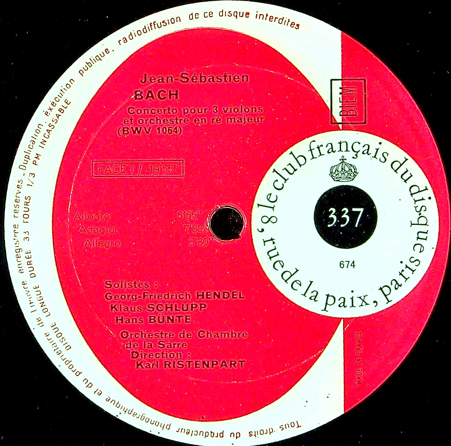 商品コード:1377-006[Club Français] K.リステンパルト指揮 G.F.ヘンデル(vn) 他/ バッハ:3Vn協奏曲BWV.1064, Vn・Fl・Cembのための三重協奏曲BWV.1044