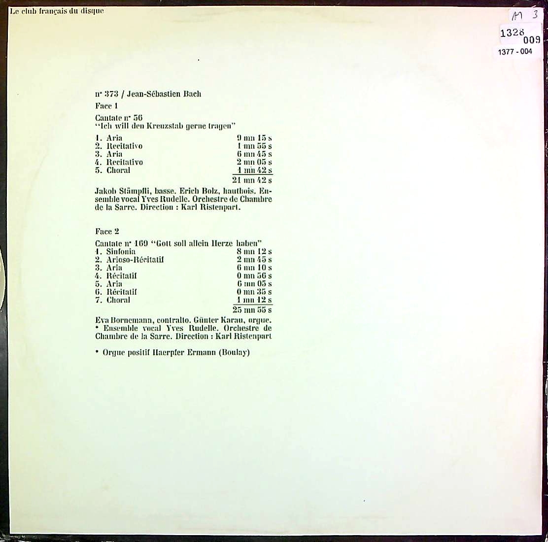 商品コード:1377-004[Club Français] K.リステンパルト/ バッハ:カンタータ56番BWV.56, 169番BWV.169