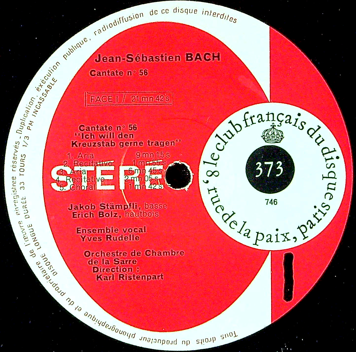 商品詳細:カンタータ56/169番の組み合わせ。56番は男性ソロの暗調の曲。169番はCemb協奏曲のテーマがOrgソロで入る明るい曲で、女声のソロが入る。まったく対照的なこの2曲をカップリングして、偏りのないバッハ・カンタータとして価値ある一枚。どちらもリステンパルトの腕は冴え渡る。個人的には169番の弾むようなテンポにポジティーフOrgの音色が印象的。リステンパルトの魔法にかけられ、バッハの世界にいきなり入れる。ステレオ/モノラル同時発売。このLPは特にプレスが多い為、非常に優秀な内容だがかなり安価な価格で提供が出来る。プレスが多いということは当時それだけ人気が高かったという証拠でもある。音質も非常に良い。リステンパルトは1960年前後にDFからLe Club Français Du Disqueに移籍したことで随分と自由な選曲が可能となり、録音数も10倍近く増えた。何より自分たちの本拠地であるザールブリュッケンの北西ザールイ(Saarlouis)の近くのフラウラウターン(Fraulautern)に録音設備が整い、パリまで録音に出掛ける必要がなくなったことは大きい。しかし1967年カール・リステンパルトは亡くなってしまう。これはLe Club Français Du Disqueレーベル自体の存続に関わるほどの重大な事件であった。当然とも言えるがその1年後の1968年には1953年に創設されたLe Club Français Du Disqueレーベルは事実上活動を停止したらしい。約7年という短い期間がLe Club Français Du Disqueにおけるカール・リステンパルト/ザール室内管弦楽団とそのメンバーたちの全てである。