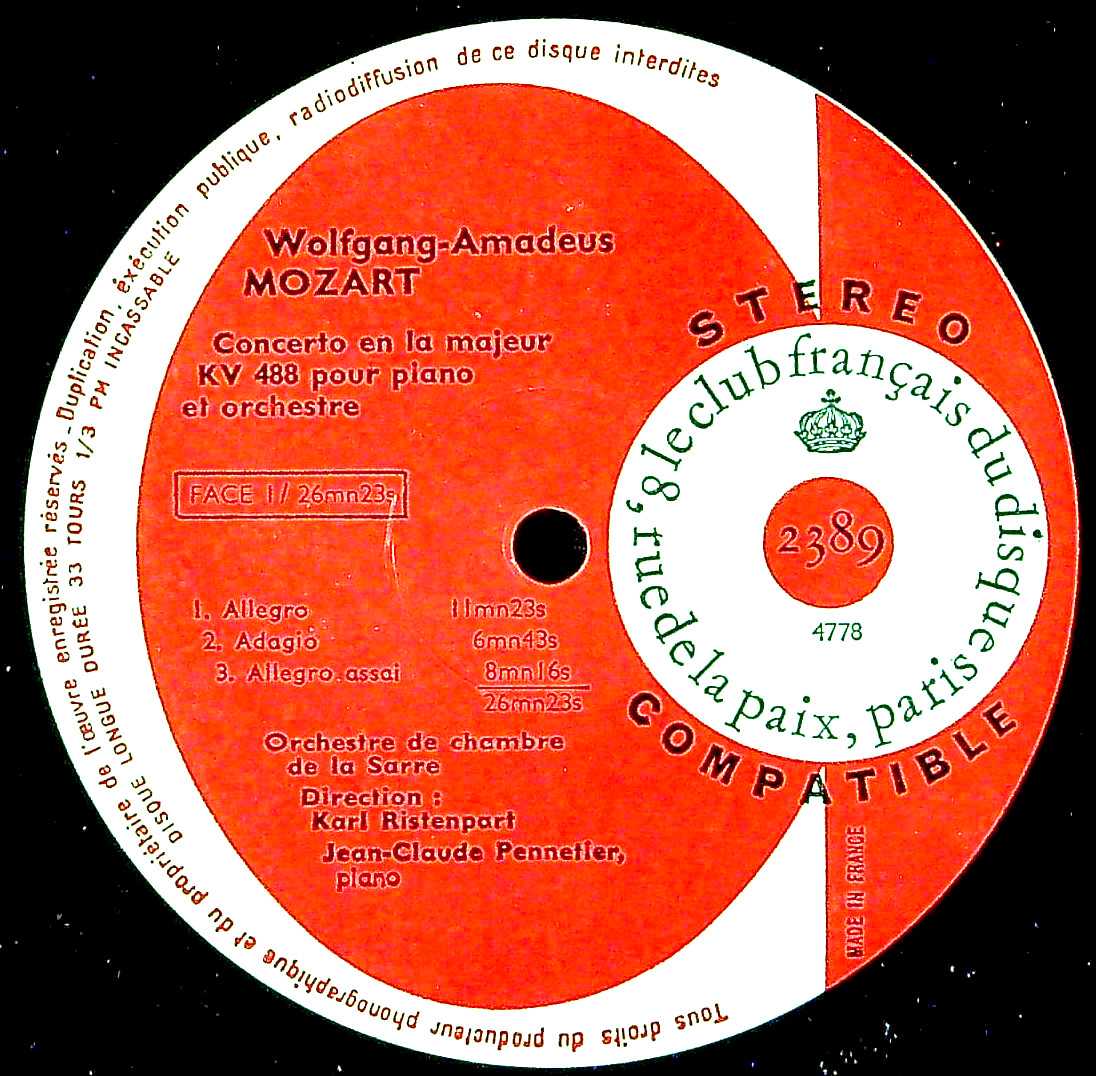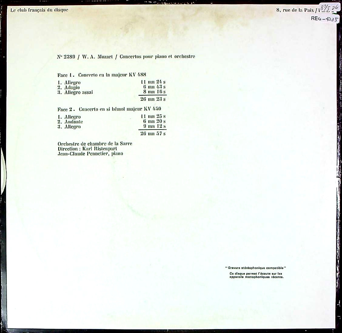 商品コード:REG-4235[仏Club Français] J.C.ペヌティエ(pf)/ モーツァルト:Pf協奏曲23番K.488, Pf協奏曲15番K.450