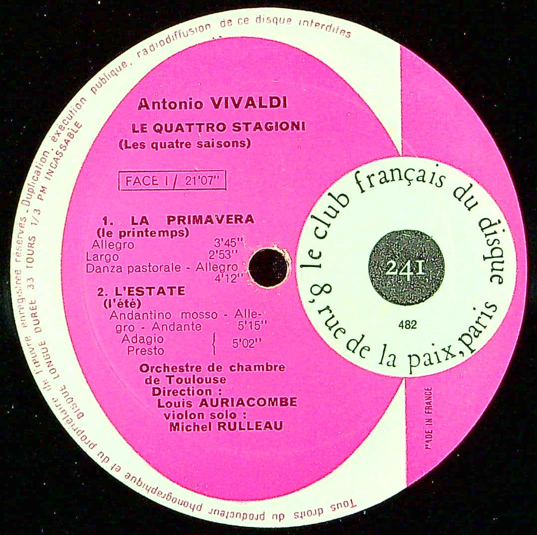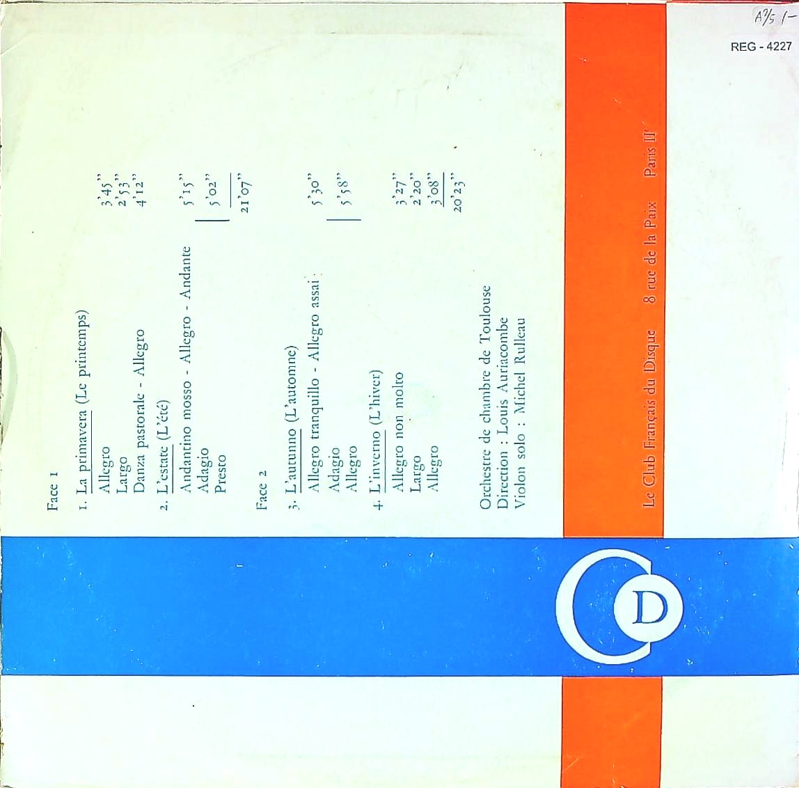 商品コード:REG-4227[仏Club Français] L.オーリアコンブ指揮 M.ルロー(vn) / ヴィヴァルディ:「和声と創意の試み」Op.8より「四季」