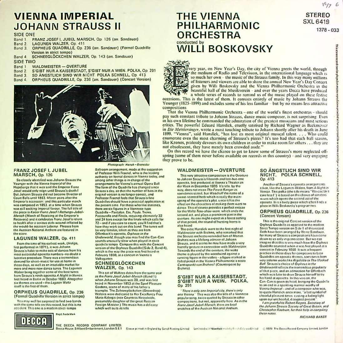 商品詳細:大DECCA最終期のミゾ無しでオリジナル。ニューイヤーコンサート1970年であるが、「Vienna Imperial」とタイトルの付いたウィーン物に仕上がっている。シュトラウス2世の曲ばかり8曲取り上げ、祝賀ムードたっぷりで、タイトル通り皇帝を讃える曲で始まり、ワルツと続き、ウィーン風情が盛り上がる。ジャケ裏のVnを持ちながらタクトを振るボスコフスキーの姿にすべてが象徴されている。華やかさに満ちた1970年のウィーンが手にとる様だ。音質良好! 1966年頃からニューイヤー・コンサートとしてのLPは発売されていたものの、タイトルはそれぞれバラバラで○年用ニューイヤー・コンサート--という記載はなかった。この1970年分からジャケットに New Year's Concert 19** とのタイトルが付くようになる。ウィーンフィル・ニューイヤーコンサートの歴史は古く、1939年大晦日のにクレメンス・クラウスの指揮により初めて開催された。第2回は1941年の1月1日の正午(CET)に開催された。1986年までに登場した指揮者はクレメンス・クラウス(1939(大晦日)、1941-1945、1948-1954。計14回)、ヨーゼフ・クリップス(1946-1947。計2回)、ウィリー・ボスコフスキー(1955-1979。計25回)、ロリン・マゼール(1980-1986等)の全部で4人に過ぎないが、1987年のカラヤン以降は、同じ指揮者が2年連続して指揮することはなくなった。テレビ放送は1959年より開始された。1969年よりカラー放送となる。録音はモノラル期はクレメンス・クラウス指揮のものが1954年頃から数年分存在するが何年のための物かはっきりしない場合が多い。また数か月前のスタジオ録音を使っていた。ジャケットにニューイヤー・コンサート19**年と書かれたLPはこの1970年用が最初である。またこの録音は本当の1970年1月1日に行われた録音ではないと思われる。本当の元日のライヴ演奏が収録されたLPは1980年代に入ってからと思われる。従ってこれらDECCAのニューイヤー・コンサートと付いたLPはニューイヤー・コンサートの疑似体験をしてもらうための事前の録音であり、実際の元日の録音ではない。1980年からはロリン・マゼールに引き継がれた為発売レーベルは自動的にDECCA→DGGに移った。
