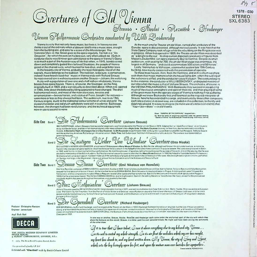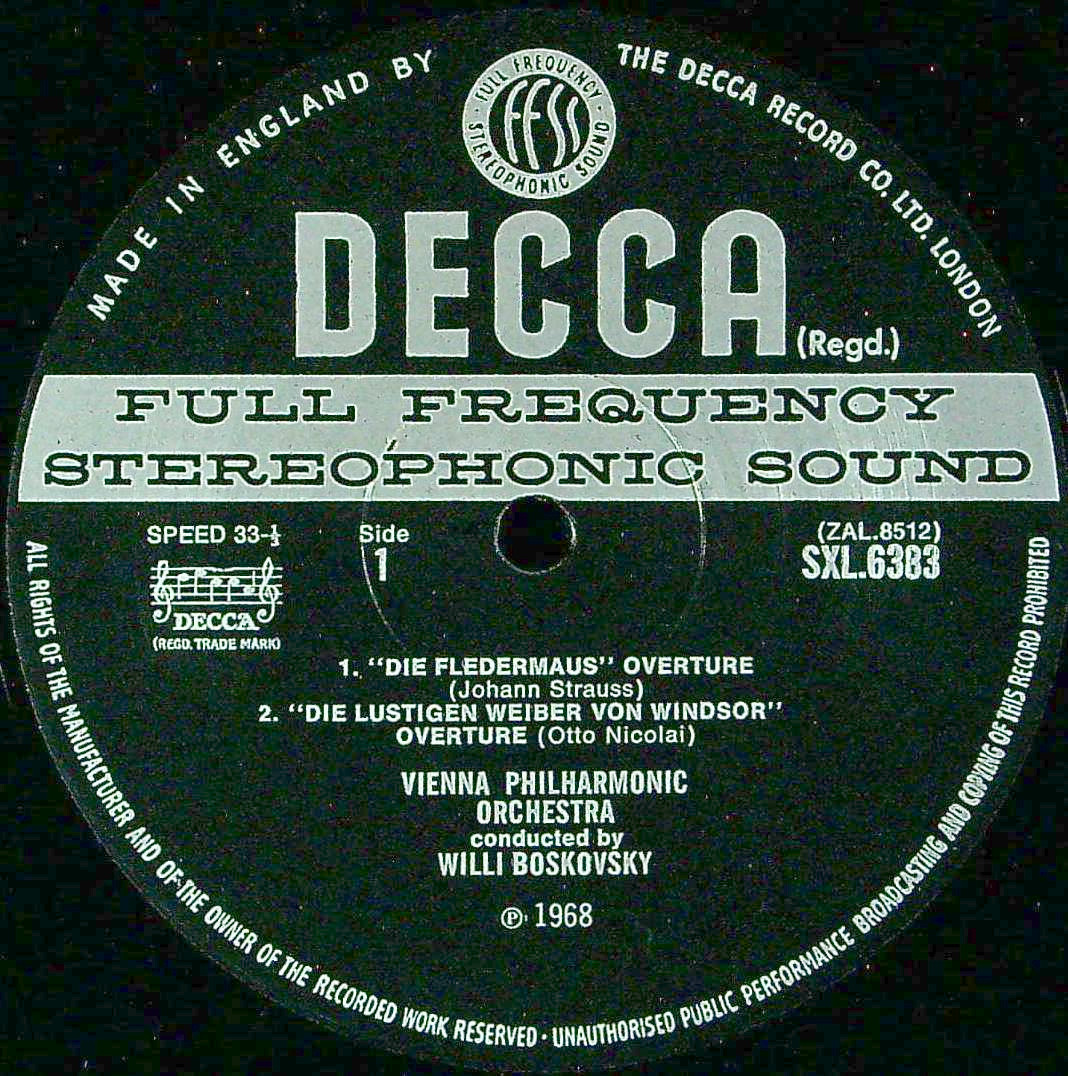商品詳細:1969年発売のウィーン物。ED3 ミゾ無し大デッカがオリジナル。C.クラウス亡き後、1955~79年までのニューイヤーコンサートを牛耳ったボスコフスキーのウィーン物とくれば、もはや何も恐れるもの無しの天下を取った状況。交代を許さなかったその理由こそが、圧倒的な彼の音楽性と、Mr.ウィーンを名乗る資質があったからに他ならない。SXLの力を借りずとも可能だったろうが、この高音質録音の効果は絶大で、モノラル好みの方でも、このシュトラウスは、SXLでなければ味わえない世界だろう。ヴィリー・ボスコフスキー( 1909 - 1991)はご存じ、オーストリア・ウィーン生まれのヴァイオリニスト、指揮者。ヴァイオリン奏法は完璧なウィーン流派であり、特にボウイング技術はウィーンのヴァイオリニストの中でも群を抜いていた。ウィーン・フィルハーモニー管弦楽団のコンサートマスターを務めるかたわら、指揮活動も行った。ウィーンフィルのコンサートマスターから転じた指揮者は少なくないが、多くは他のオーケストラを地盤に活動しており、ボスコフスキーほど多くの録音や演奏会で古巣を振った例は他にいない。また、ヴァイオリニスト出身指揮者として両方で多数の録音を残した点でも稀有の存在である。1933年 ウィーン・フィルハーモニー管弦楽団入団、1949年 ヴォルフガング・シュナイダーハン のあとを受けて、第1コンサートマスター就任(1970年まで)。1955年1月1日 ニューイヤーコンサートに指揮者として初出演。1950~60年代のボスコフスキーはオーストリアでは大統領に次ぐステータスを誇っていたと言われた。特にヨーロッパ中にテレビ中継が開始された年には「一夜にしてスーパースターになった」とまで評された。ヨハン・シュトラウス2世に倣って、ヴァイオリンを弾きながら、時折弓を振りつつ指揮するやり方で、ヨハン・シュトラウス一家のワルツやポルカなどを演奏した。当時のDECCAではボスコフスキーのウィーン物は「作れば売れる」という状態だったと思われる。クレメンス・クラウスの弟子である。当時からクレメンス・クラウス、カラヤンの指揮での録音にはソロとして出演していた。このLPのタイトルは「Overtures Of Old Vienna」でウィーンpo.はボスコフスキーの時代となり、飛ぶ鳥を落とす勢いの黄金時代の録音の一つである。1960年代前半までに発売されれたシュトラウス・ファミリーのLPで「ウィーン物はボスコフスキー」という固定化が決定した。以前のクレメンス・クラウス時代を知らない世代もステレオとの同時発売が手伝って、ボスコフスキー=シュトラウス・ファミリーという図式が完成したのである。これは1969年分ニューイヤーコンサート相当分と思われる。ボスコフスキーは本来指揮者ではなく、コンマスである。大物指揮者が振った方が良いに決まっている。しかし、ものは試しとコンマスにヴァイオリンを指揮棒代わりにやらせてみたら拍手喝采の嵐となったというわけである。いとも簡単に弾き振りスタイルに騙された聴衆だが、DECCAも騙されたふりなのか、本当に騙されたのか知らないが、1980年頃までこの暫定スタイルが続いてしまった。クレメンス・クラウスの崇高な指揮からみれば子供だましに等しいが、売れたのだから良しとしたのである。重ねて書くがボスコフスキーはヴァイオリニストである。