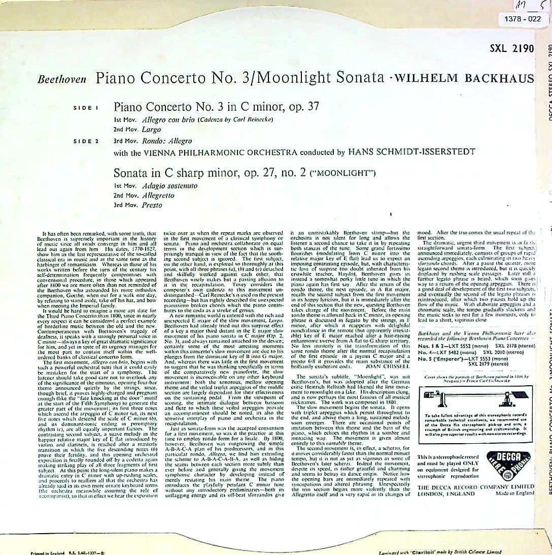 商品コード:1378-022[DECCA] W.バックハウス(pf)/ ベートーヴェン:Pf協奏曲3番, Pfソナタ14番「月光」