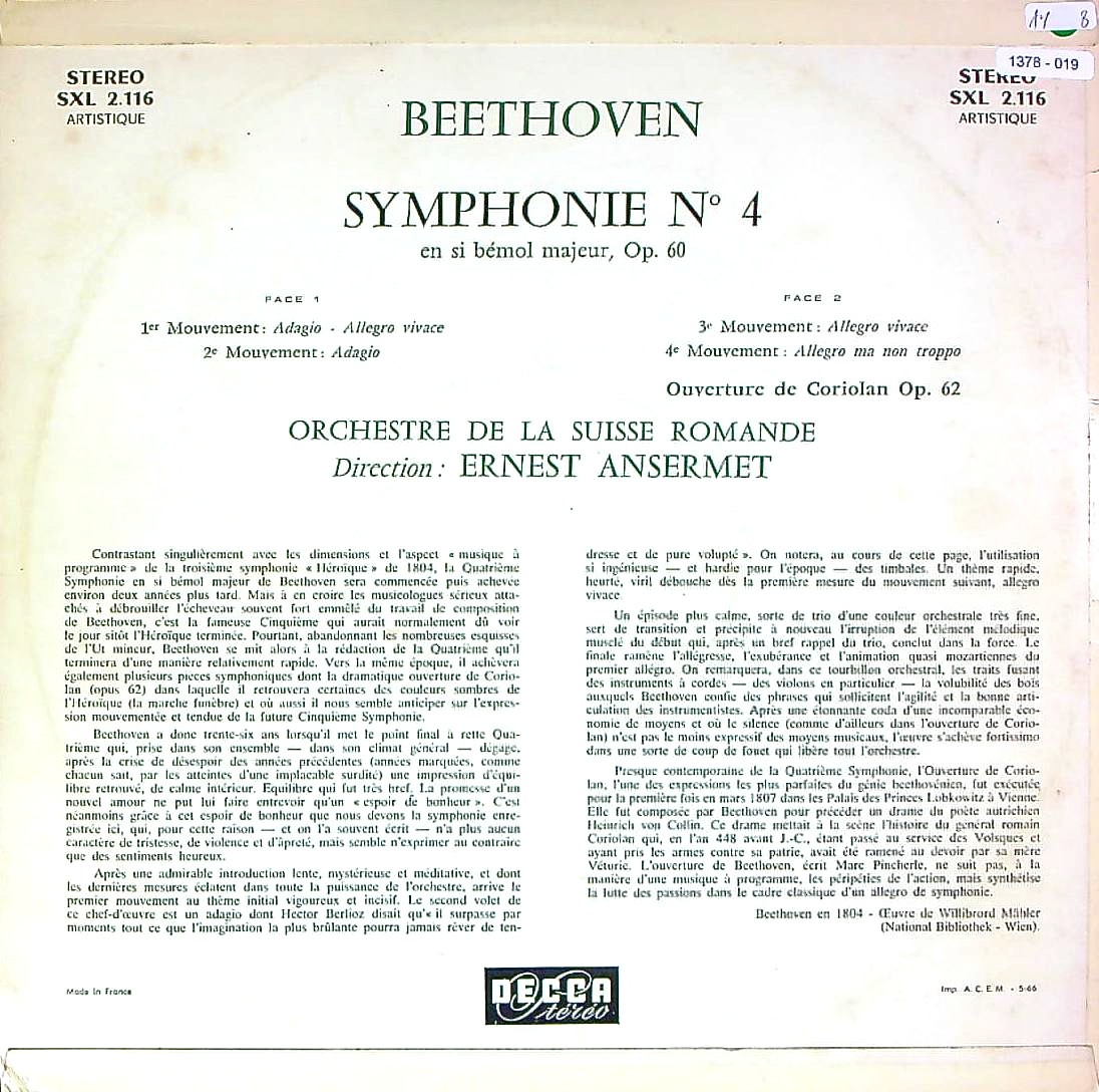 商品コード:1378-019[DECCA] E.アンセルメ/ ベートーヴェン:交響曲4番Op.60, コリオラン序曲Op.62