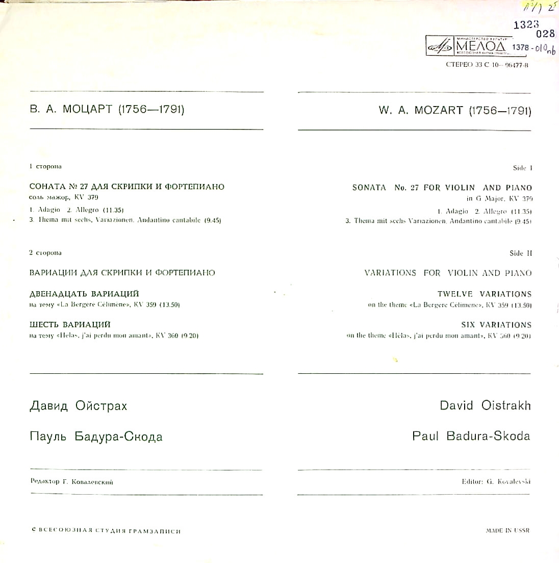 商品コード:1378-010nb[MELODIYA] D.オイストラフ(vn)/ モーツァルト:Vnソナタ集-3/Vnソナタ 他