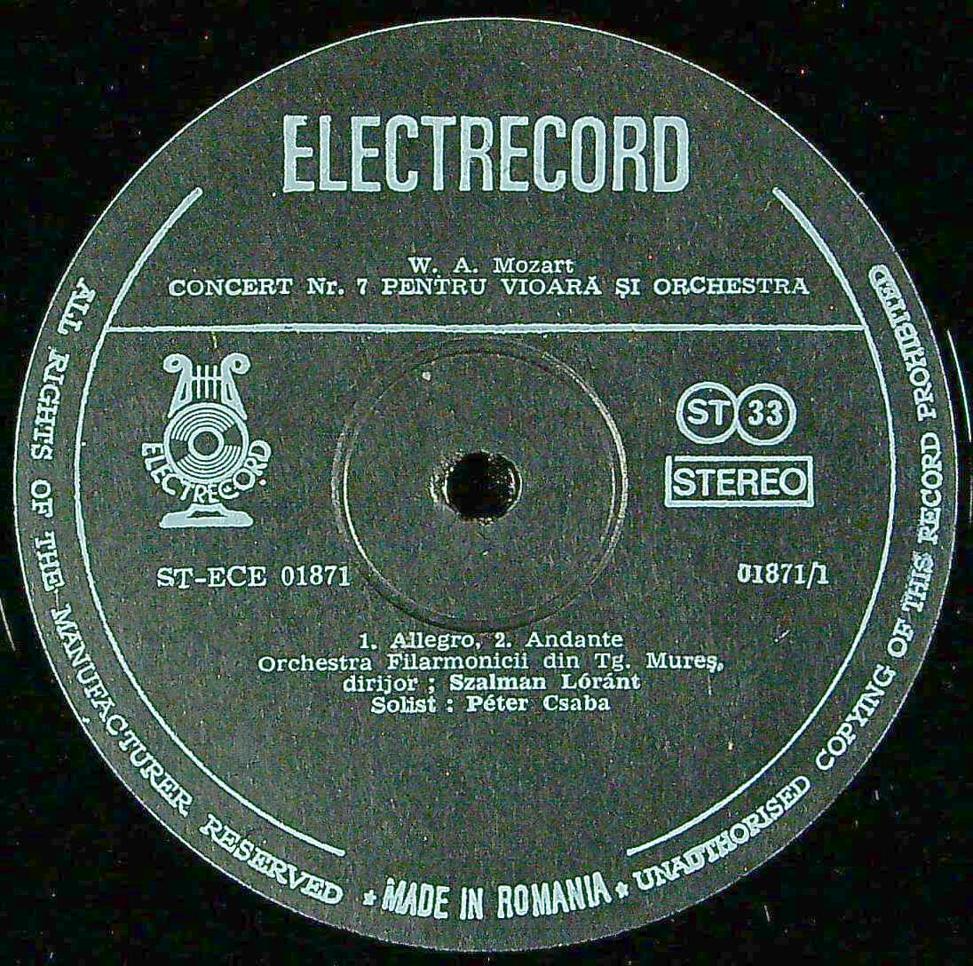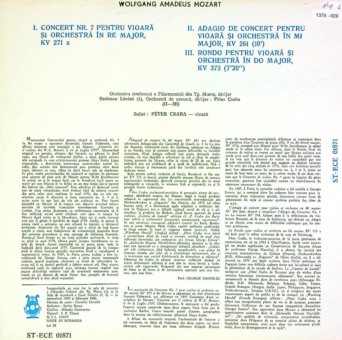 商品コード:1378-009[Electrecord] P.チャバ(vn)/ モーツァルト:Vn協奏曲7番K.271a, アダージョK.261, 協奏風ロンドK.373
