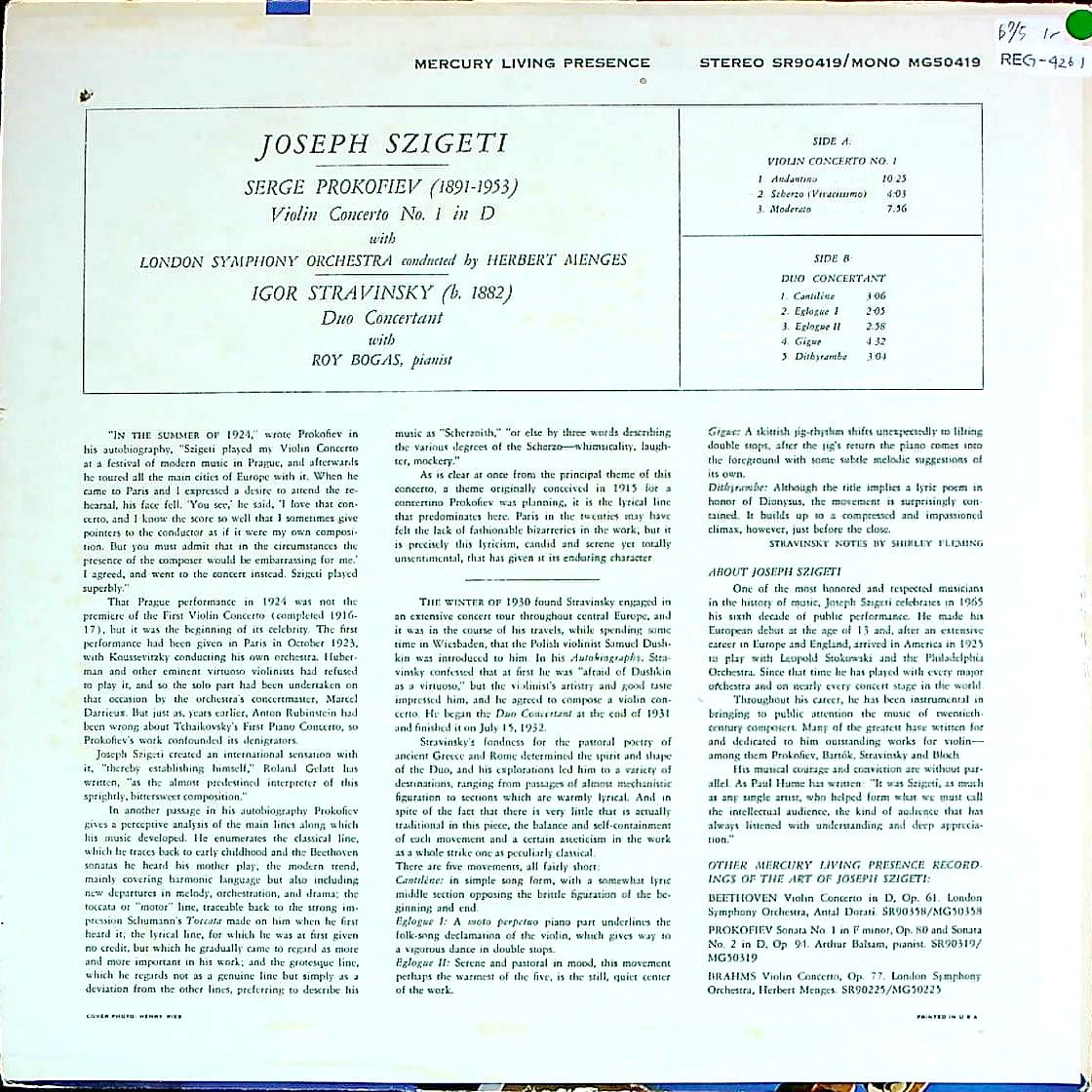 商品コード:REG-4261[米MERCURY] J.シゲティ(vn)/R.ボーガス(pf) / プロコフィエフ:Vn協奏曲1番Op.19, ストラヴィンスキー:協奏的二重奏曲