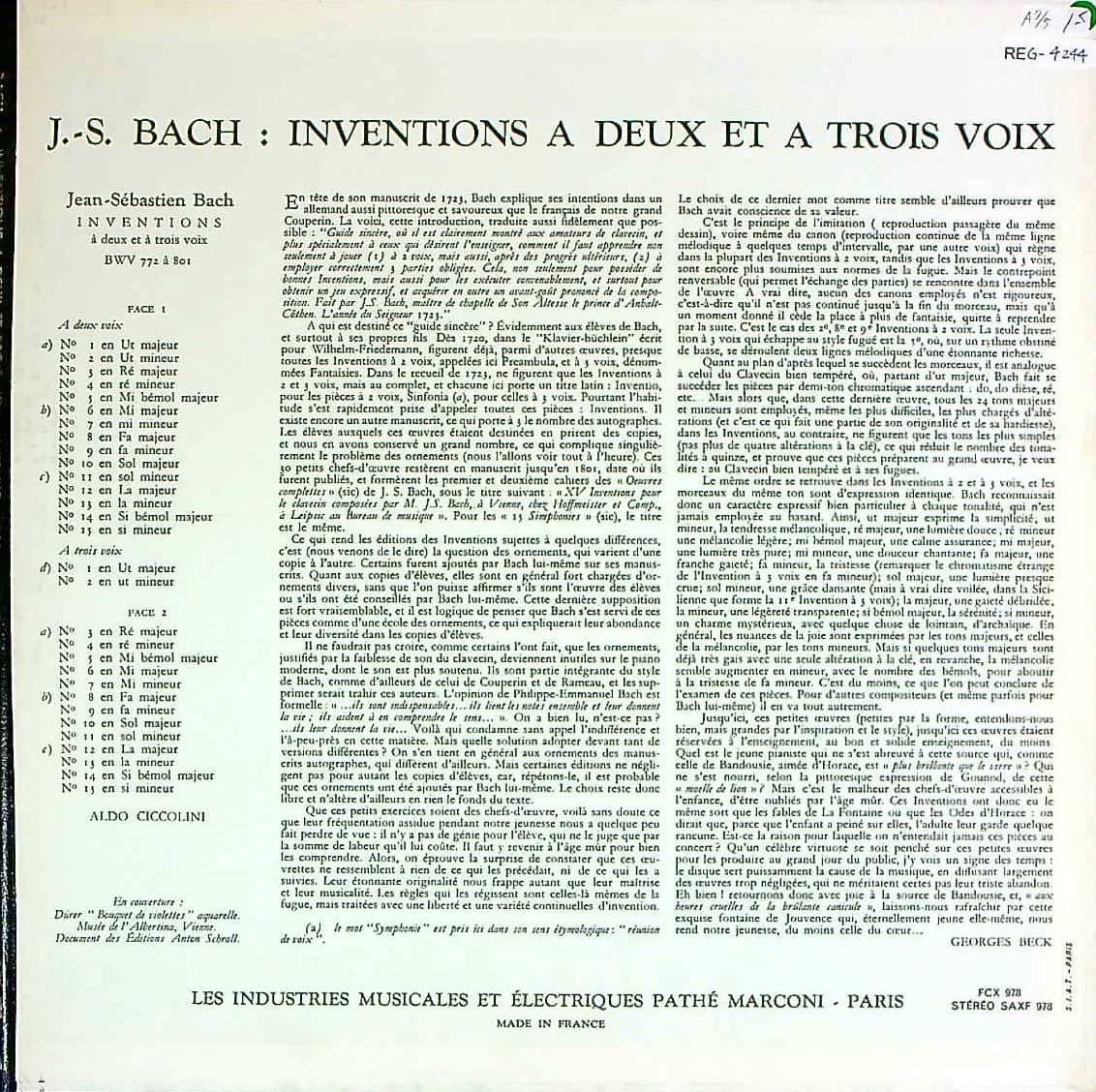 商品コード:REG-4244[仏COLUMBIA] A.チッコリーニ(pf) / バッハ:インヴェンションとシンフォニア(全30曲)