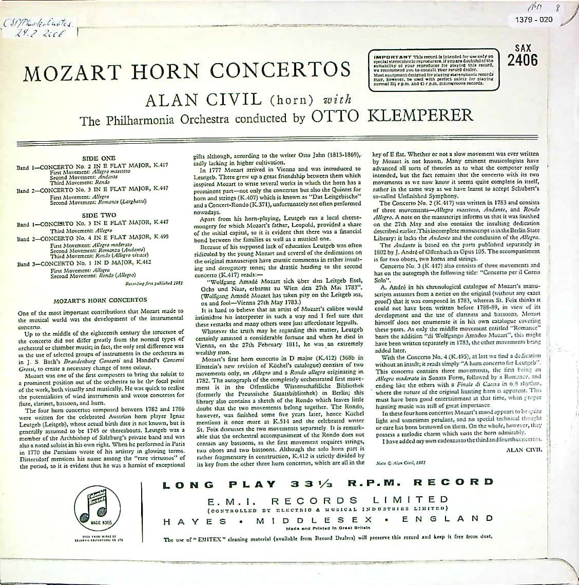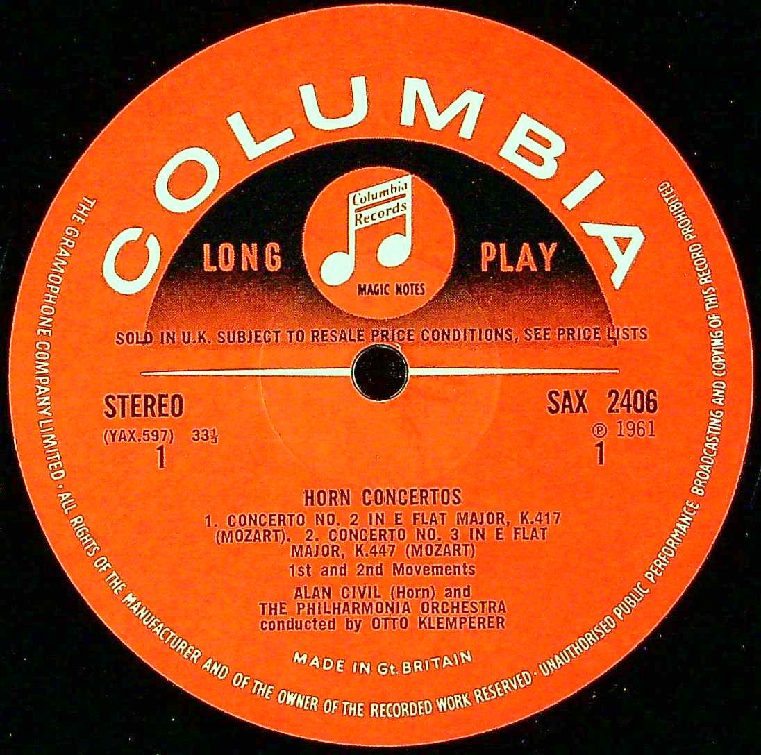 商品詳細:SAXオリジナルの入荷は少ない。仏ではSAXF 211→CCA 899、独プレスが対象から外れた今、英プレスは貴重。'50年代のD.ブレイン/カラヤンの33CXが今もって神格化され、その信頼度が揺らぐ事がないのは事実。ステレオで何かとお考えの方にはこれがベストだろう。Hrが旋律を吹くには少々まったりした所があるが分、オケも同調しないとバランスが取れない、そういう点でこの録音の成功はクレンペラーにあると言って過言ではない。ホルン奏者のアラン・シヴィル(Alan Civil ・1929– 1989)は英国ノーサンプトンの出身。10代で軍楽隊に参加した。デニス・ブレインの父オーブリーに師事。指揮者のトーマス・ビーチャムによって、デニス・ブレインの次席奏者としてロイヤル・フィルハーモニー管弦楽団に採用される。デニス・ブレインがフィルハーモニア管弦楽団に移籍すると、首席奏者を引き継いだ。1955年に、シヴィル自身もフィルハーモニア管に異動し、1957年にブレインが自動車事故で死去すると、首席ホルン奏者に就任した。1960年代に、ベルリン・フィルハーモニー管弦楽団への入団を打診されたが、アラン・シヴィルはフィルハーモニア管弦楽団に留任し続けた。1966年にBBC交響楽団の首席ホルン奏者に就任し、1988年に引退するまでその座を守った。王立音楽大学でも教鞭を執った。1985年に大英帝国勲章を授与された。シヴィルは2→3→4→1番の順序で録音している。この順序は作曲順ではないかと言われている。以前は1番が最初の作曲とされていたが新しい研究では最後の作曲らしいことが有力視されている。ゆったりしたこの時期のクレンペラーのテンポで演奏され、正にシヴィルとクレンペラーの共演となっている。ブレイン/カラヤンからの呪縛から解放されるピッタリの録音!録音時シヴィルは31歳だった。1966年R.ケンペ指揮ロイヤルpo.とRCAに再録音している(LSC 2973)。ステレオ初出は安価ではない。