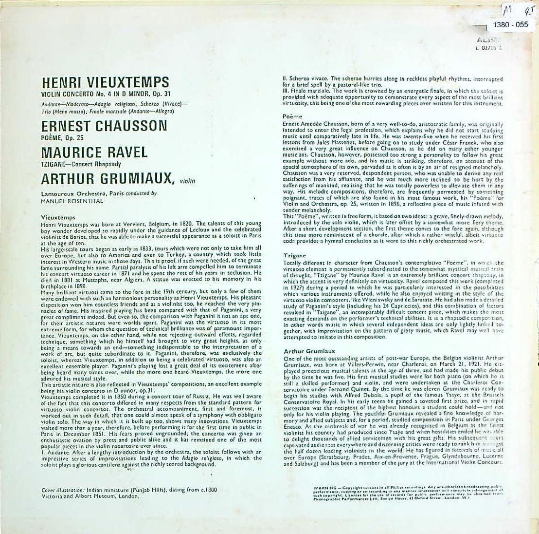 商品コード:1380-055[PHILIPS] A.グリュミオー(vn)/ ヴュータン:Vn協奏曲4番Op.31, ショーソン:詩曲Op.25, ラヴェル:ツィガーヌ