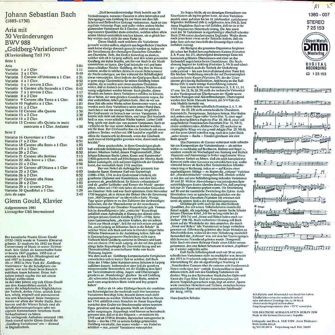 商品詳細:欧州ではCBS:D 37779。1981年の2回目録音。人生に、この曲を2回以上録音したピアニストは他にもいる。しかし、グールド程、世に知れ渡ったピアニストもいないだろう。グールドのCDで初めてバッハを聴いたという人が、実際多いようだ。そういう意味で、クラシックという、ある意味固定化した世界に話題を作ったことは確か。この2回目のゴルトベルクも、ETERNAから出ているという事実。しかも、なかなか音が良く、オリジナルより、こちらを残そうか…と思っても不思議はない。ところでこの2回目のプレスは相当の数がプレスされたらしく、珍しさは欠片もないLPになってしまった。その為ドイツ盤などは当社では1.200円程度に落ち着いてしまった。しかしETERNA盤とくれば面白さは何倍にもなるだろう。だからCBSほど安価ではないが手元に残すなら他の人がまず待っていないようなプレスなら納得がいくのでは。なおこれはグールドの最後の録音ではないが生前に発売された最後のLPとなった。デビュー盤と人生最後のLPが同じ曲という偶然が増々グールドを神格化してしまった。改めて聴いてみるとこれもやはりグールドにしか出来得ない演奏であることは確かだろう。尚、米Columbiaはグールドの死期を悟って最後のLPとなるように発売時期を調整したのではという疑念があるが、おそらく偶然であったと思われる。ETERNAからも出ていたことは驚きだが、ETERNAでは1988年にETERNAの技師により独自のスタンパーが製作されETERNAの工場でプレスされている。ジャケットデザインは全く同一ながらしっかりとETERNAサウンドに仕上がっている所が良い。西ドイツ盤と比べ非常に希少な東ドイツ盤。希少性において大きな差がある。ETERNAでは同年末・または翌年分から729 153という番号に変わるので注意!