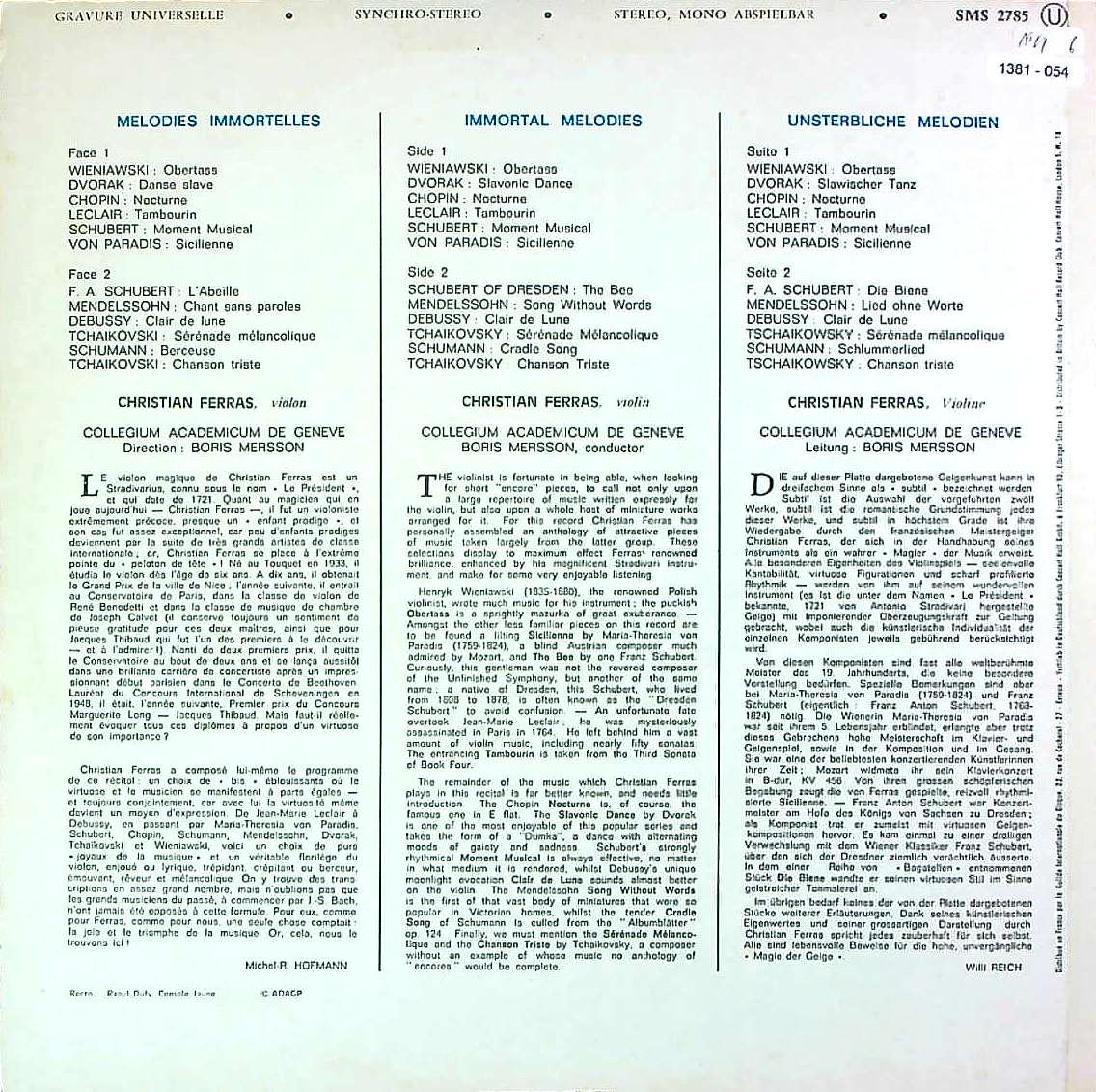 商品コード:1381-054[GUILDE du DISQUE] C.フェラス(vn)/ Vn小品集/ヴィエニャフスキ, ドヴォルザーク, ショパン 他