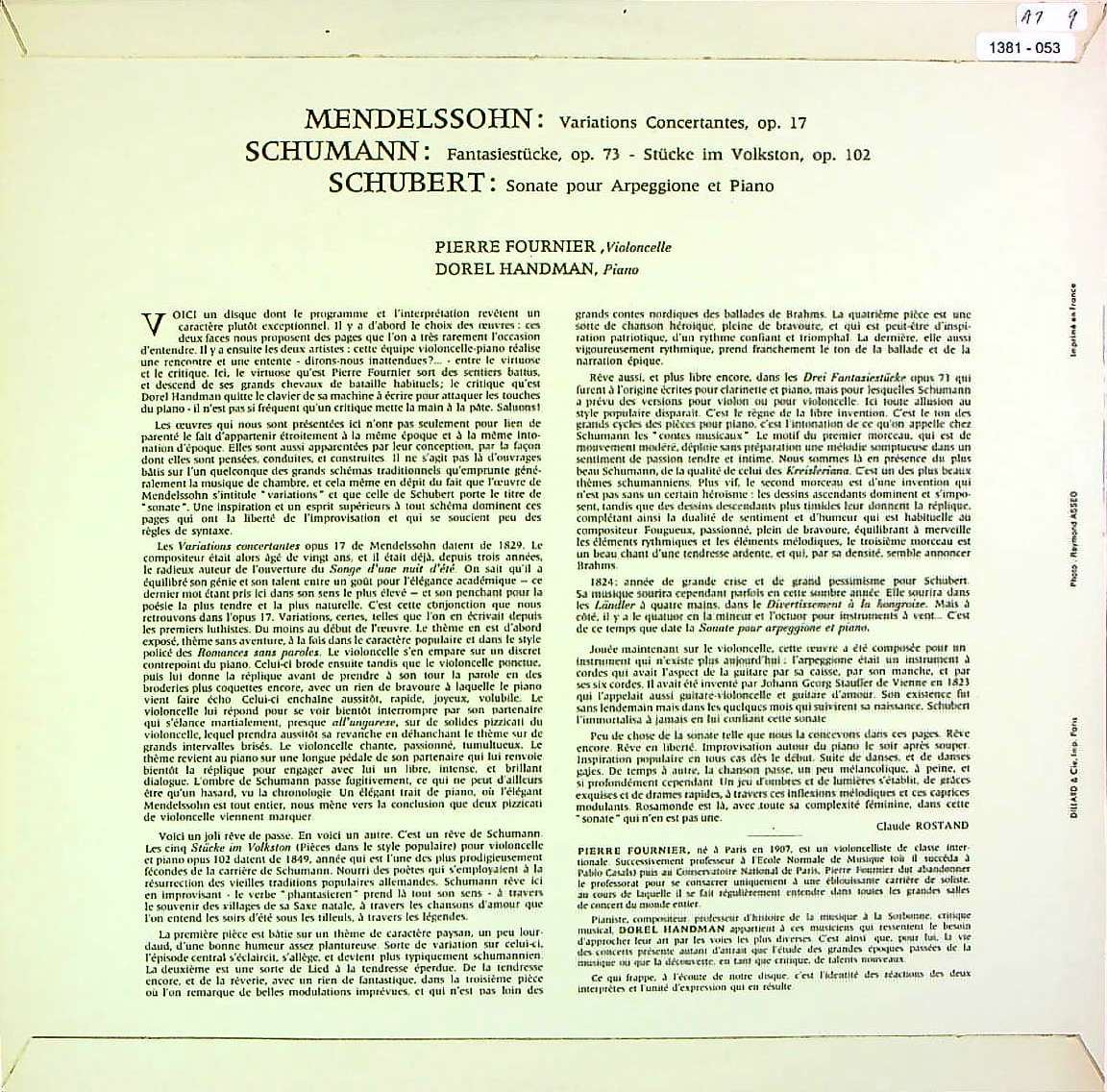 商品コード:1381-053[GUILDE du DISQUE] P.フルニエ(vn) メンデルスゾーン:協奏変奏曲, シューマン:幻想小品集 他, シューベルト:アルペッジョーネ・ソナタ