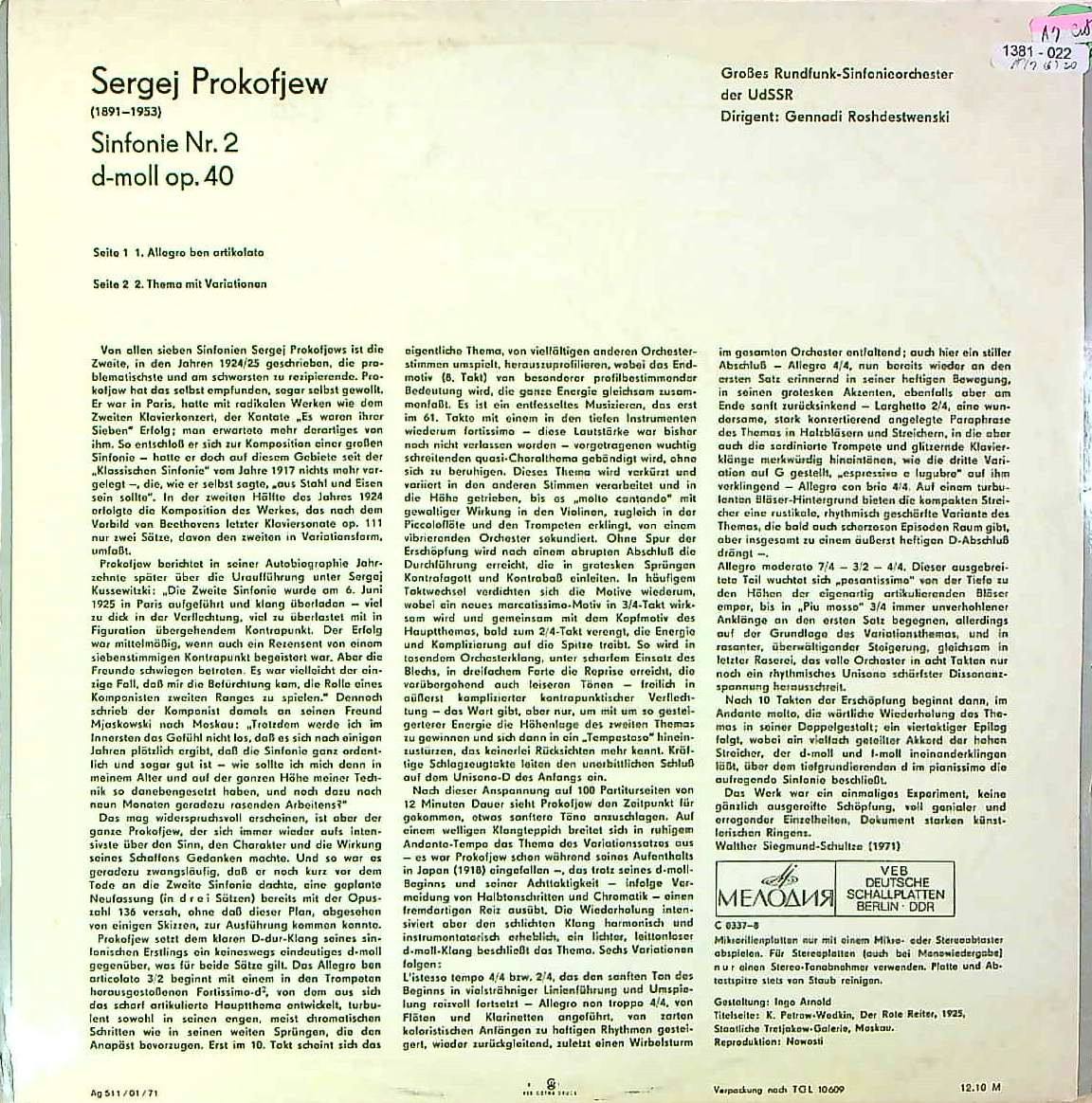 商品詳細:おそらくこれがMELODIYAで最初の1962-8年モスクワでのモノラル/ステレオ録音による交響曲全集。MELODIYAではDLステレオでバラ6枚が初出の形(2番のみプレ・ステレオレーベルあり)。ロジェストヴェンスキーは全集をかなり録音しているが、プロコフィエフが順番として早い時期になったのは頷ける。西側にはマルティノンもあるが、いかにマルティノンでもロシア勢には敵わない。日本人には馴染みの薄い曲ではあるが、ショスタコ等も注目されている昨今である。軽快にしてロシア的リズムの大波にさらわれる気分。MELODIYAが勿論オリジナルだが、ETERNAファンの方にはETERNAのバラセットがベストだろう。1971年と1973年にMELODIYAの工場でETERNA向けにイコライザー調整されETERNAサウンドに仕上がっている。ETERNAのバラセットは当社といえども、そう頻繁に出来るものではない。ロシア作品はロジェストヴェンスキーに任せておけば間違いはない。1962-8年録音の比較的初期の録音なので爆演傾向が強い!MELODIYAでは1→7番:C 01619(1・7番)/0337(2番)/01445(3番)/01467(4番)/01135(5番)/01253(6番)でリリースされた。3/4番のみ旧モノ録あり。ETERNAも凄いパワーがありオーディオファイルLPである。Le Chant du MondeでもLDXA 78404-9でリリースされた名演!ETERNAはステレオのみでジャケットデザインも統一され存在感は大きい!