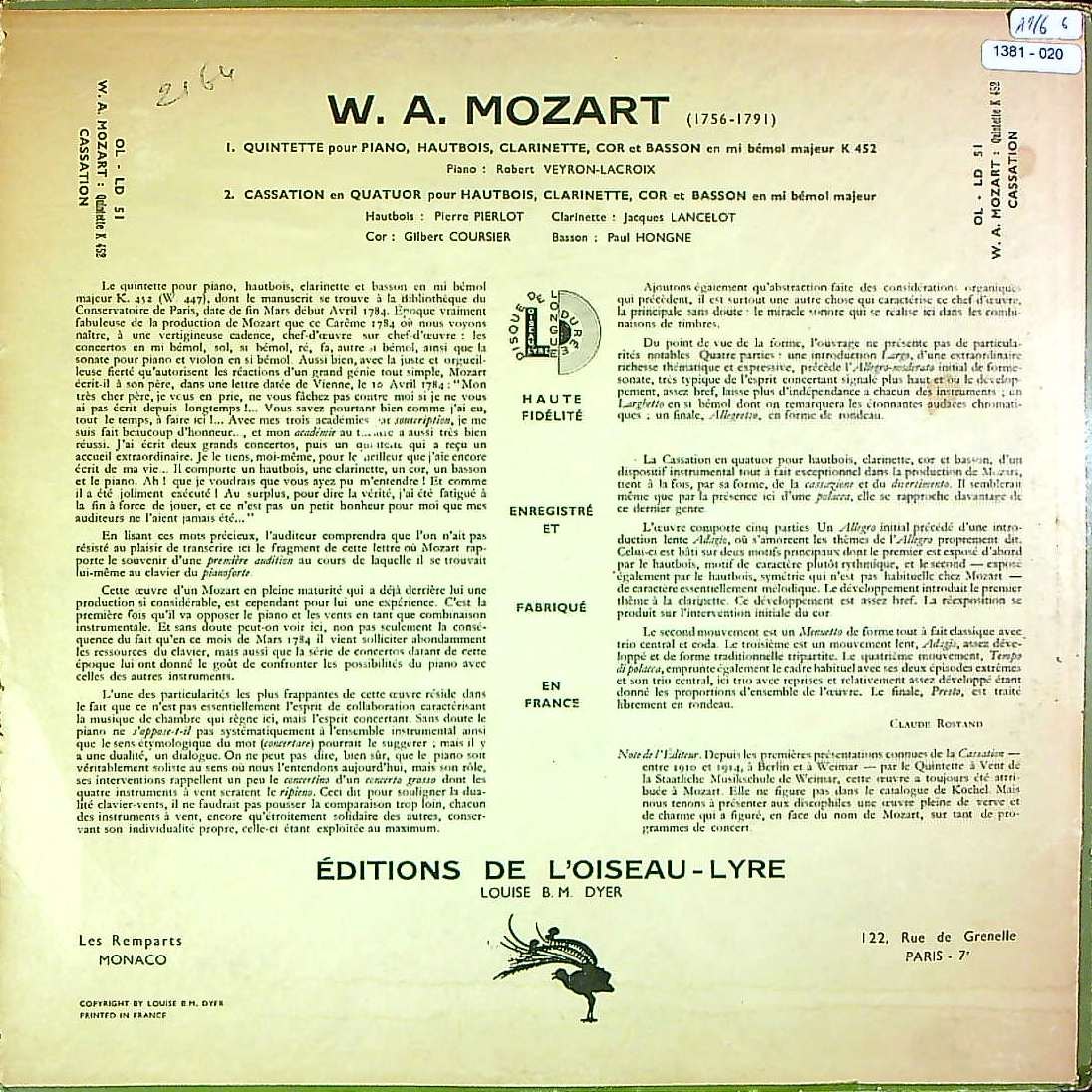 商品コード:1381-020[L'OISEAU LYRE] R.ヴェイロン・ラクロワ(pf) 他/ モーツァルト:Pf五重奏曲K.452, カッサシオン変ホ長調(偽作)