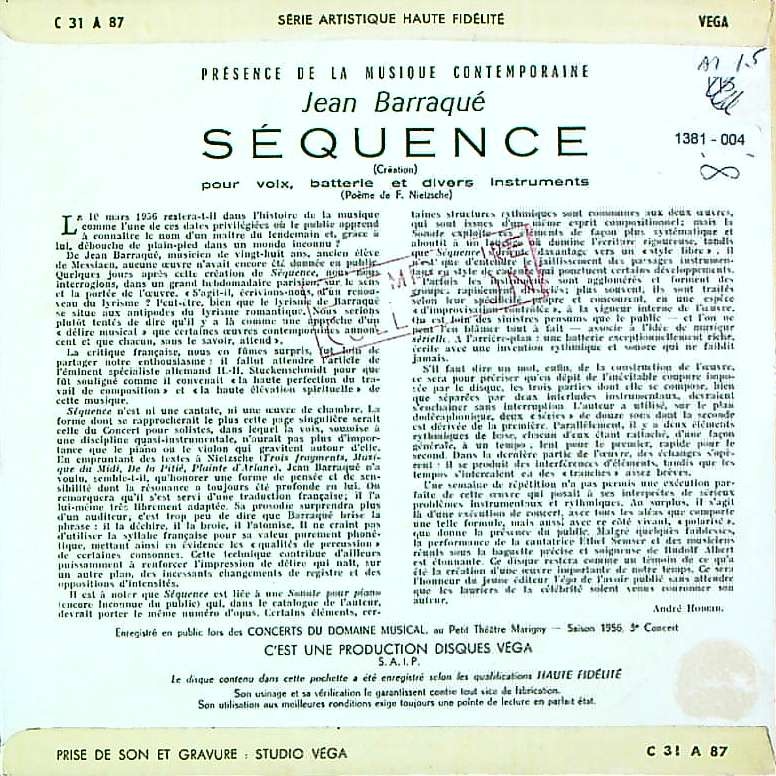商品コード:1381-004[VÉGA] Y.ロリオ(pf) E.スムセ(s) 他/ J.バラケ:セカンス(1956)