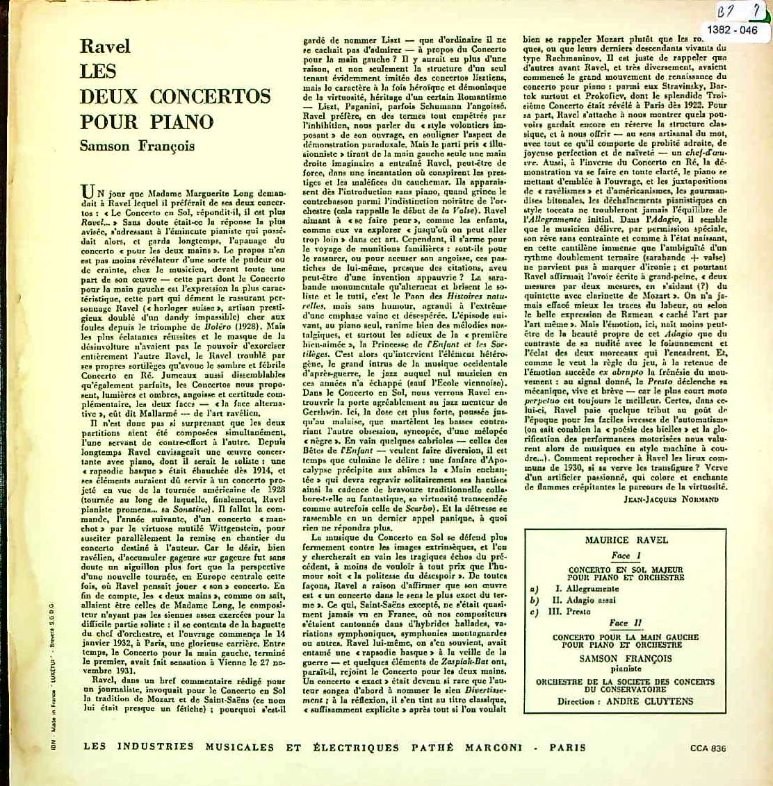 商品詳細:久しぶりの入荷になるS.フランソワ(pf)A.クリュイタンス指揮パリ音楽院o.によるラヴェル:Pf協奏曲、左手のためのPf協奏曲。仏ステレオ初出はSAXF 136で発売され、その後同じ棒付ボードSAXF 836というレコード番号に変わる。その後'70年代まで再版される事になる名盤。改めて聴いてみてフランソワの素晴らしさを思い知らされた。ペルルミュテル、アルゲリッチ、ミケランジェリ等の名演もあるが、一つを選ぶとしたら当盤で決まりだ。文句なしの決定盤!最も有名なフランソワの録音でラヴェルの協奏曲の手本のような洒落っ気タップリの演奏。英国人やドイツ人が死ぬほど頑張ってもこういう演奏はできやしない。ソロだけでなくオケがクリュイタンス/パリ音楽院o.というのも成功の重要な要素だろう。きっちりしていてはラヴェルではない。砕けすぎては一時の共感のみで終わる。自由奔放なのに曲として完成度が高い。これが名演の最大のポイントだろう。二人の共演はそのバランスをしっかり押さえて、いかなる新しいスタイルをも凌駕する時代を超越した演奏である。純クラシックピアニストで曲が持つジャズ的なフィーリングをしっかり出せる人は多くない。不摂生がたたり46歳で早死にしたフランス人天才ピアニストはフランスで最も愛された。ドイツは彼を退廃の象徴とみなしたのか1枚たりとも発売しなかった。プレスの種類は多く、聴く方法は多数あるが、どうせステレオで聴くなら1960年代の仏COLUMBIAレーベルで聴きたい。1968年頃からCVB 836になり自動的にLa Voix De Son Maîtreからの発売となる。仏COLUMBIAレーベルは1960年代中~後期に廃止されLa Voix De Son Maîtreに統一される。英国も似たような経過を辿った。この録音は人気が高く多くの種類でステレオ盤が存在する。SAXF 136→SAXF 836→CCA 836→CVB 836→1970年頃CVL 836→1972年頃2C 069-10867--と変遷する。価格は年代と盤質が反映される。SAXF 136で盤質7以上なら44.000円はする。それを基準に価格体系を形成している。再版が必ずしも価値がないとは言えない。相応の価値があり、それぞれの年代で再版の新品が定価で売られていた。それを考えるとある程度の年代の再版でも決して高額とは言えない。2020年代のレプリカ新譜の価格をみれば、決して高額ではない。