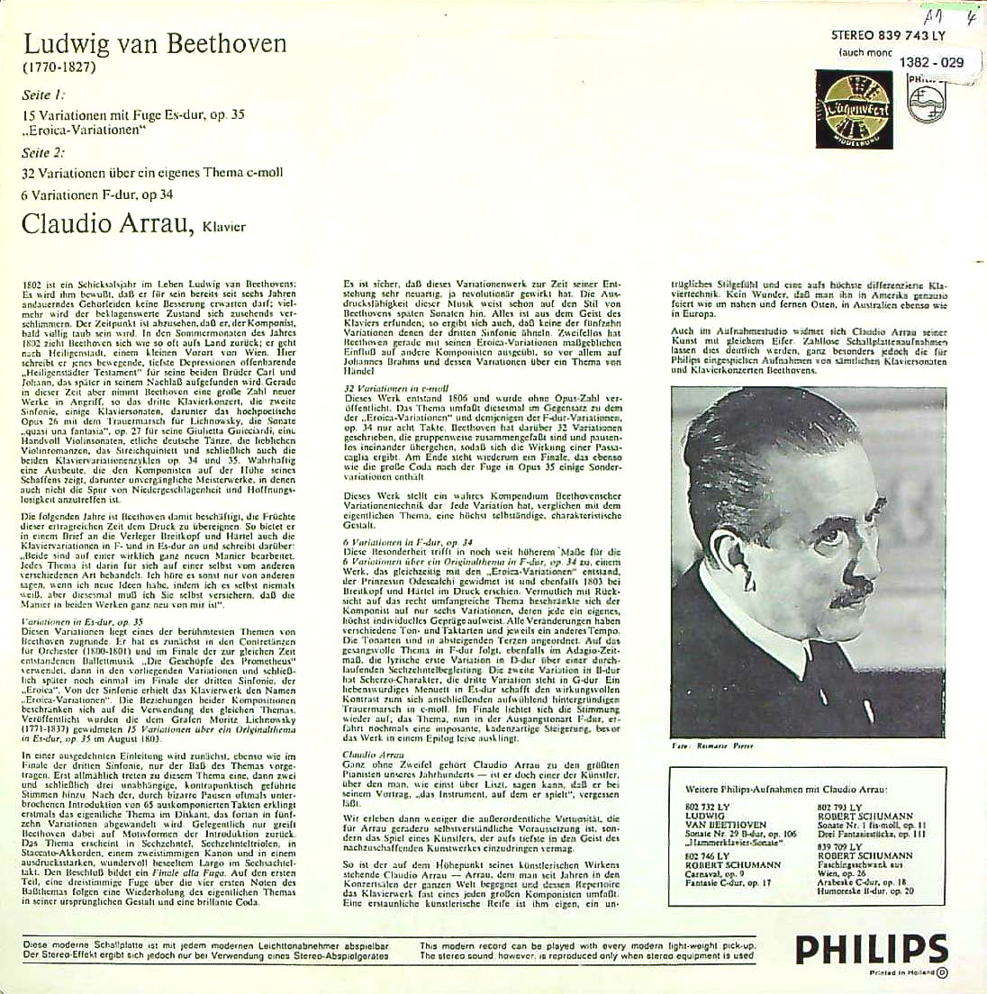 商品コード:1382-029p[PHILIPS] C.アラウ(pf) / ベートーヴェン:エロイカ変奏曲Op.35, 6つの変奏曲Op.34, 32の変奏曲WoO.80