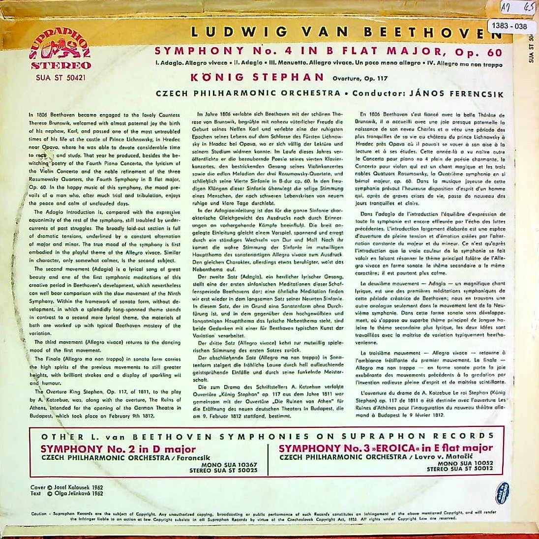 商品コード:1383-038[SUPRAPHON] J.フェレンチク/ ベートーヴェン:交響曲4番Op.60, シュテファン王Op.117~序曲