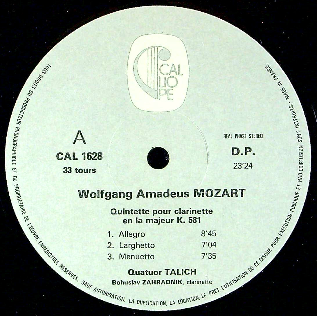 商品コード:1383-014[CALLIOPE] B.ザフラドニーク(cl) ターリヒQt. / モーツァルト:Cl五重奏曲K.581, 弦楽四重奏曲3番K.156