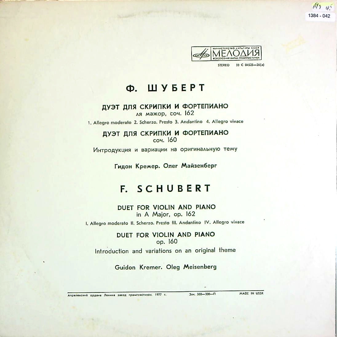 商品コード:1384-042n[MELODIYA] G.クレーメル(vn)/ シューベルト:VnとPfのための二重奏曲Op.162, 変奏曲Op.160