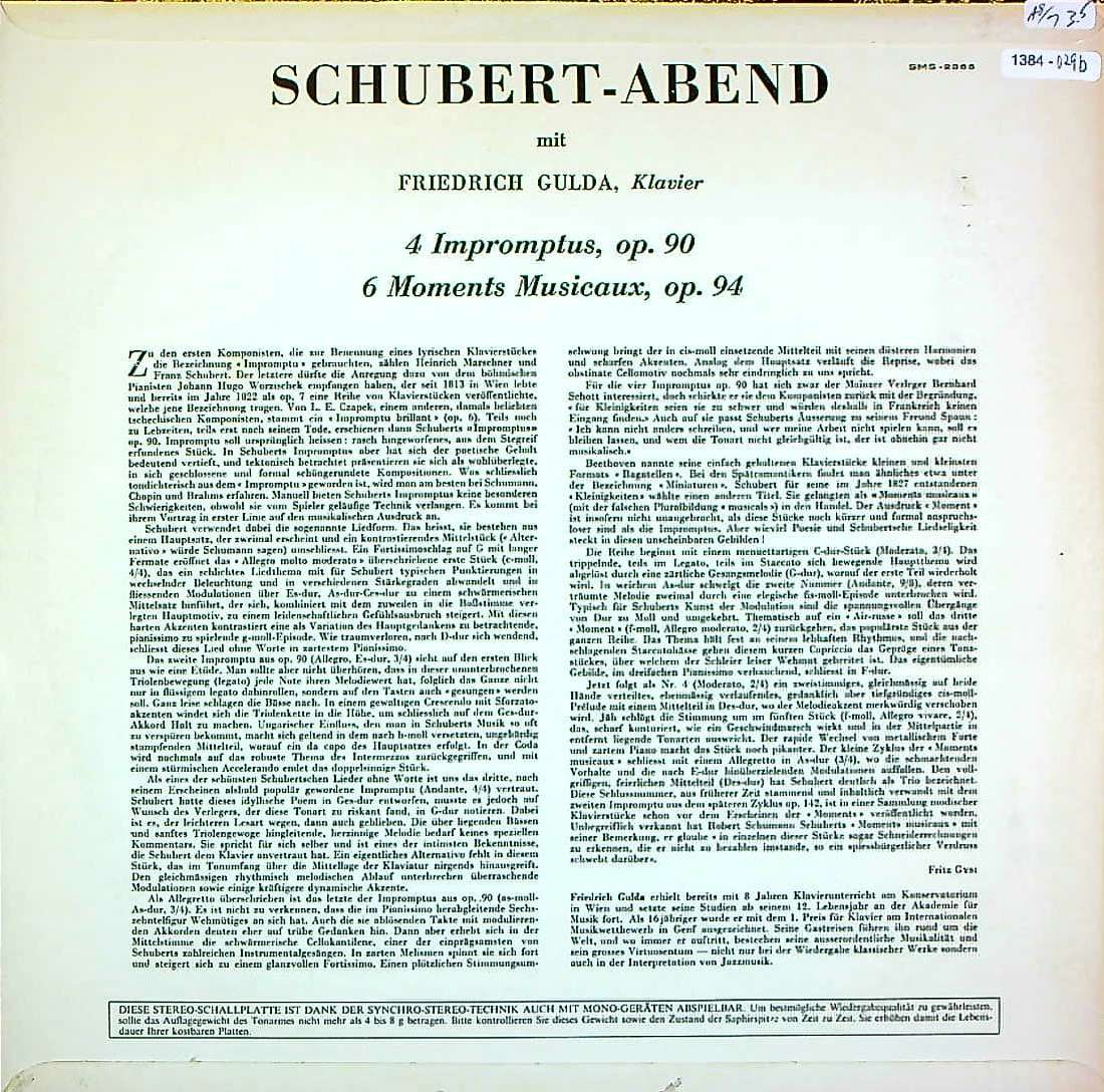 商品コード:1384-029b[Concert Hall] F.グルダ(pf) / シューベルト:4つの即興曲D.899, 楽興の時D.780