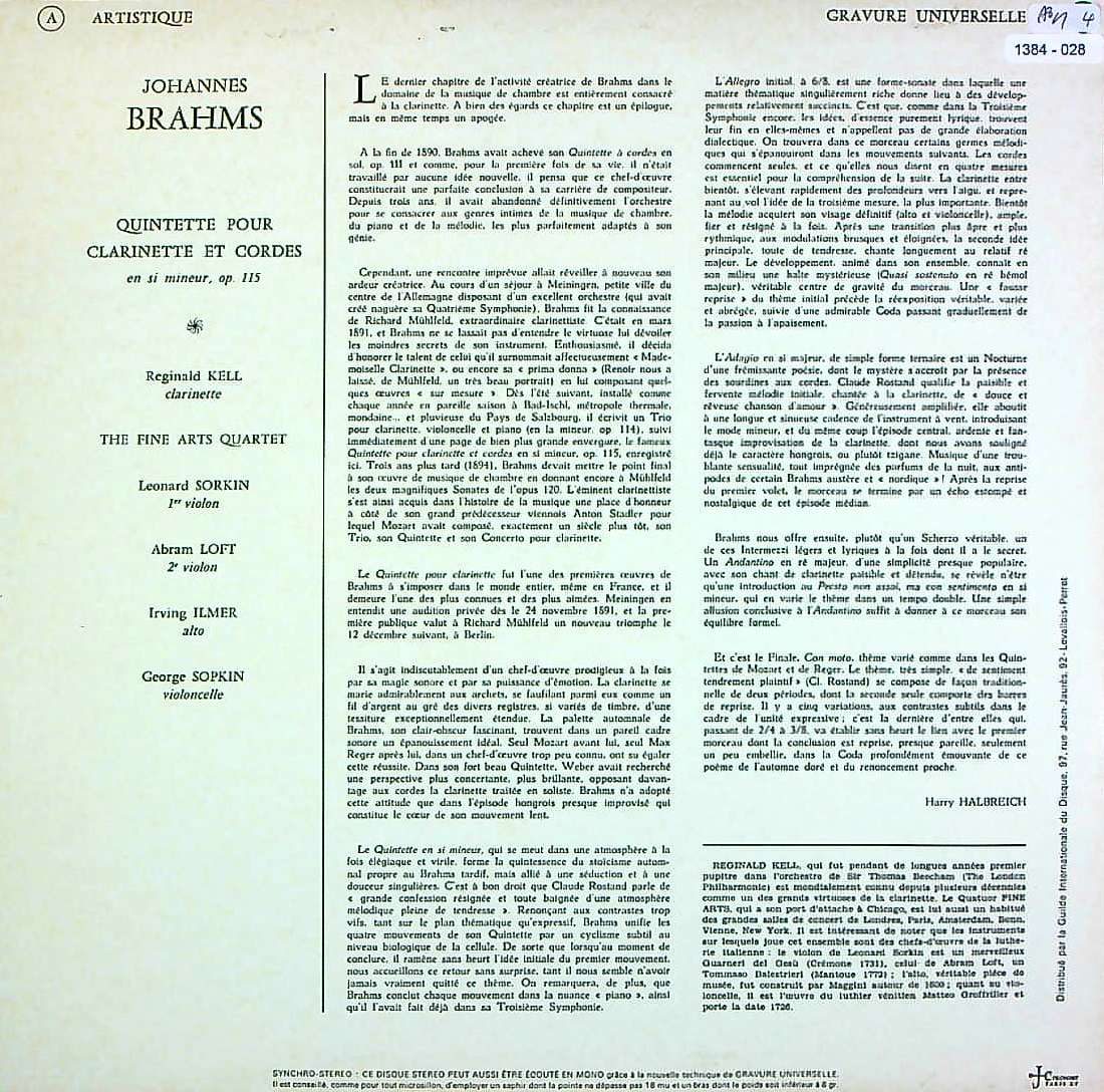 商品コード:1384-028[Concert Hall] R.ケル(cl) ファイン・アーツQt. / ブラームス:Cl五重奏曲Op.115