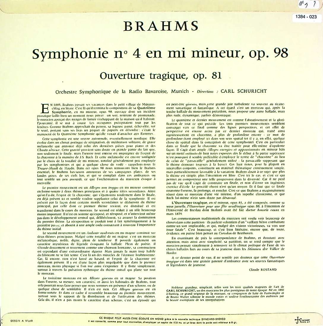 商品コード:1384-023[Concert Hall] C.シューリヒト/ ブラームス:交響曲4番Op.98, 悲劇的序曲Op.81