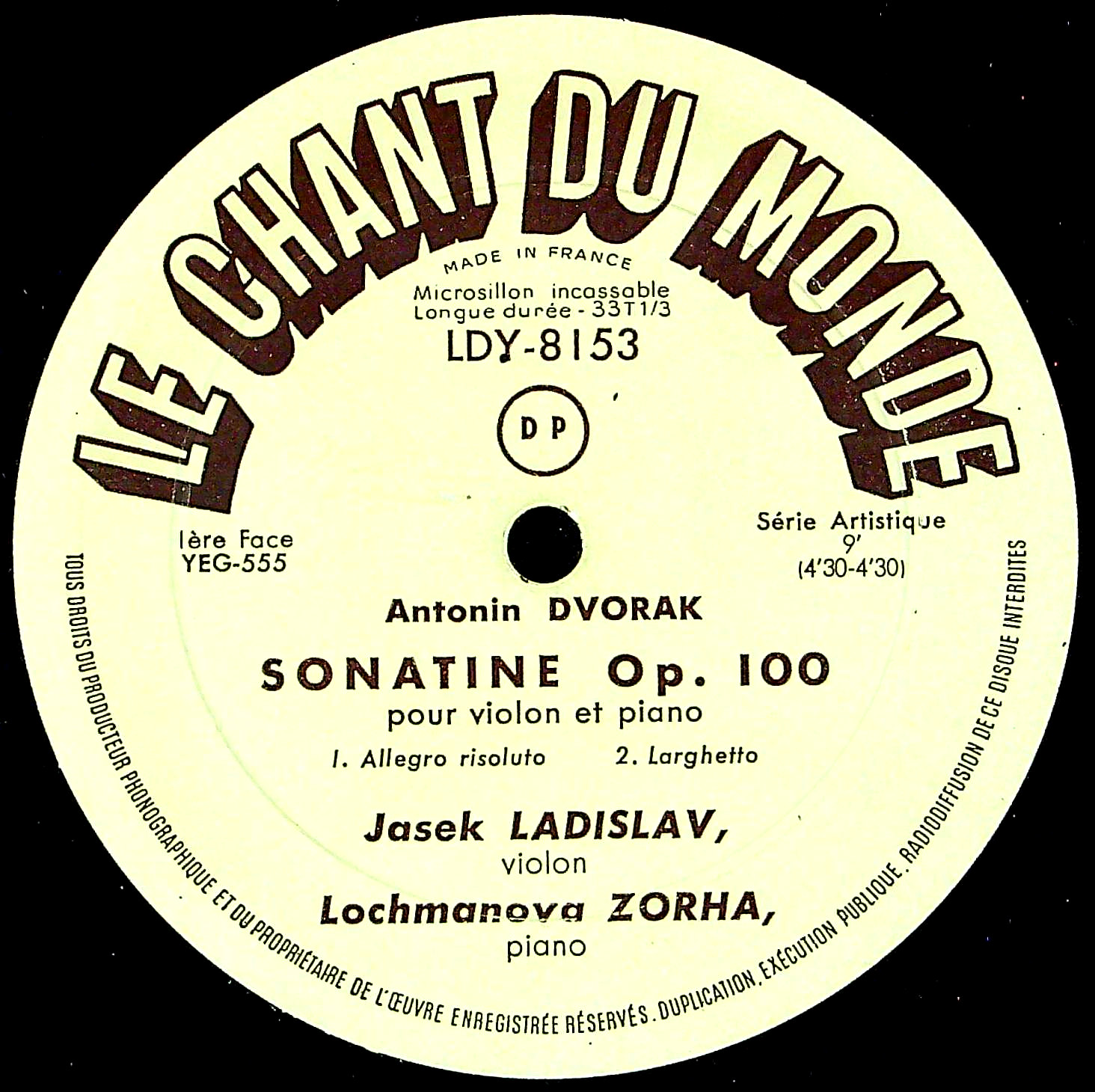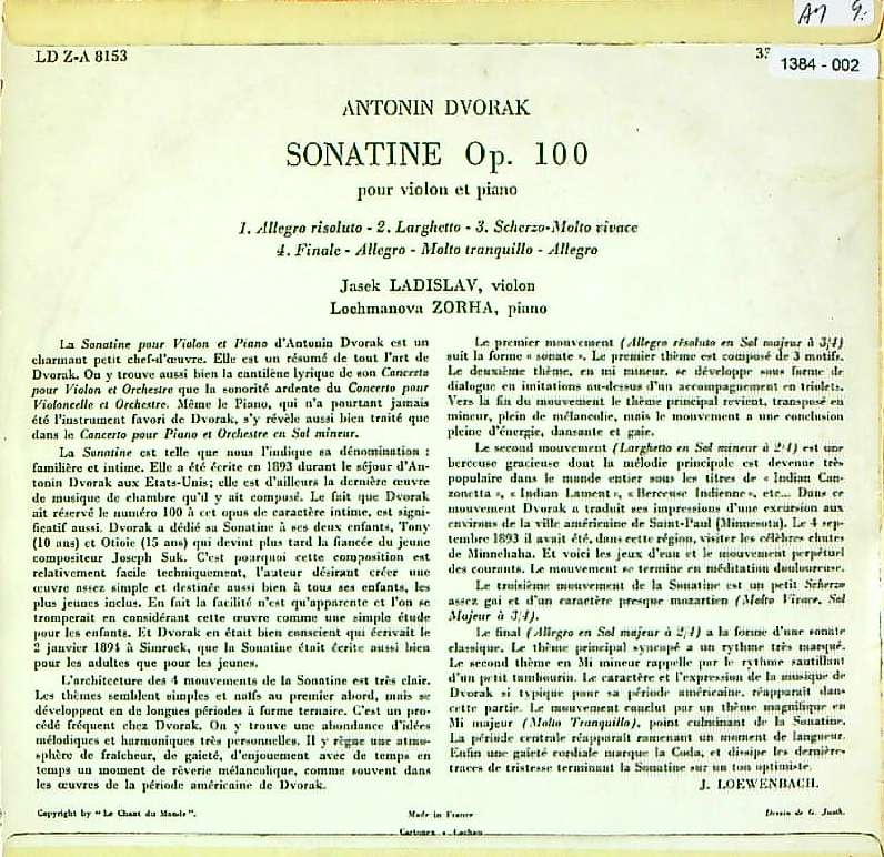 商品詳細:ドヴォルザークのヴァイオリンとピアノのためのソナチネ ト長調作品100は1893年11月19日から12月3日にかけてニューヨーク市で作曲したソナチネであり、同時にドヴォルザークが米国滞在中に書き上げた最後の室内楽曲。1894年にベルリンのジムロック社から出版された。本作は、ドヴォルザーが我が子の音楽的能力を徐々に育て上げていくために用意された。アメリカ時代の弦楽四重奏曲 第12番 『アメリカ』等に既に表れていたような、アメリカ先住民族の民謡や黒人霊歌に霊感を受けた旋律主題が使われており、なかんずくシンコペーションやペンタトニックが主題の特徴となっている。ドヴォルザークは1880年にヘ長調のヴァイオリン・ソナタOp.57を作曲している為、そこに隠れる形で演奏の機会は殆どない。フリッツ・クライスラーは、第2楽章を「インディアンの子守唄」と呼んで演奏したが、もちろんこれは作曲者の意図とは関係ないものである。日本における演奏(録音)のもっとも早い例として、1935年にわずか15歳の諏訪根自子がSPレコードでクライスラー編曲の第2楽章「インディアンの子守歌(インディアン・ラメント)」の録音をコロムビアレコードに残している。ソナチネには珍しく、4楽章制で構成されている。Vnのラディスラフ・ヤーセク・(1929 - 2023)はチェコのモジナ・ウ・ベロウナ生まれ。ベドジフ・ヴォルダンとインドジフ・フェルドにVnを師事した。1948年から1952年まで、チェコの舞台芸術アカデミーでヤロスラフ・ペケルスキーに師事した。また、ピアノをイロナ・シュテパノヴァーに師事した。卒業後はコンサート活動に専念し、1947年のプラハの春コンクール(第2位およびヤン・クーベリック賞)、1955年のパリのティボーコンクール(第5位)、1956年のロンドンのC.フレッシュコンクール(第1位)など、数々の国際コンクールに出場した。その後、ポーランド、ベルギー、ドイツ、イギリスをコンサートツアーした。ピアニストのヨゼフ・ハーラとの共演は特に意義深く、 1959年にはオーストラリア、インド、日本を、そして1962年には再び日本をツアーした。当時、彼は既にオーストラリアで3年間、ヴァイオリン教師およびヴァイオリンの名手として活動していた。オーストラリアに戻り、日本をはじめとする各国でマスタークラスを指導した。録音は多くないがSupraphonにスークのバッハ:Vn協奏曲集で第2VnとしてB.1043を録音している。他LPV 467、SUB 10021でVnリサイタル盤を出している。国際的な知名度こそ低いが、チェコを代表する実力派Vn奏者である。これはLe Chant du Mondeの求めに応じてフランスで録音した曲と思われる。Supraphonでは未発売。ソナチネの録音自体が少ない為、フランス市場における本場の録音として市場価値を見たのだろう。曲自体がスラブ色が強く、優秀だけでは説得力に欠けるからだろう。ピアノのゾラ・ロフマノーヴァもチェコ出身である。2人が織りなす演奏にはスラブ人が懐かしさを覚えるものがあったと思われる。全く知られていない超が付く珍品!